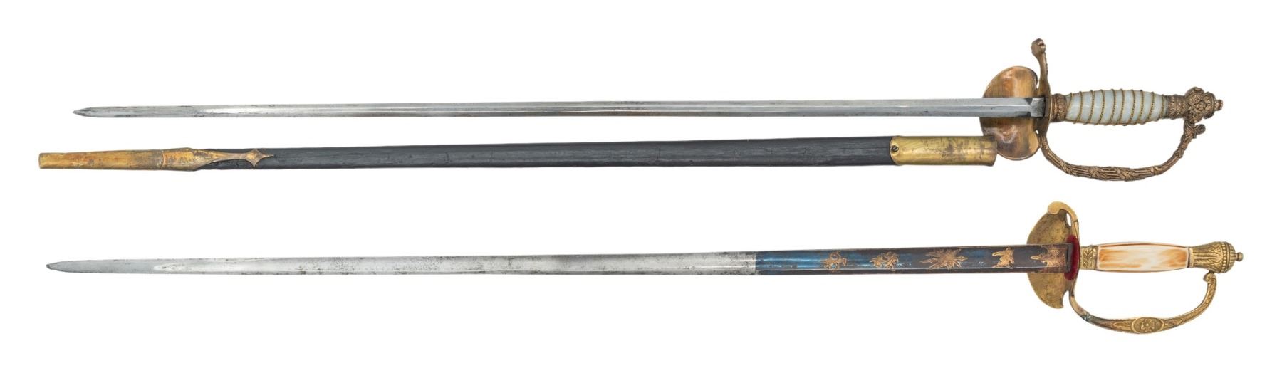 1) An attractive circa 1830 officer's sword likely of European origin measuring 37" overall with a 31 3/4" blade that has gold highlighted etching on a blued field over the first 9 1/2'. Etching includes sprays of arms and foliate motifs. There is a makers mark near the hilt the reads " A S & C ". The gilded brass hilt features a down turned shell guard with foliate motifs and a large oval emblazoned with a lion passant. The plain down turned quillon contrasts well with the elaborately decorated cross guard, knuckle bow, ferrule, and pommel. The knuckle bow also features a standing cherub and a four petal rose. The four sided chamfered edge grip appears to be a white organic material. No scabbard. CONDITION: blade has a light to medium gray patina, and the vast majority of the blue and gilt decoration remains. The hilt retains most of its gilded finish and the grip has a few tight cracks. 2) A fine circa 1840 officer's sword likely of European origin, quite possibly French measuring 36" overall with a 30 1/4" plain blade. The gilded brass hilt features a down turned shell guard with a Napoleonic style eagle & foliate motifs. Decorated cross guard and columnar knuckle bow with a heavily embellished pommel and ferule. The wire wrapped two piece grip appears to be stone, possibly Onyx. Gilded brass mounted leather scabbard. CONDITION: blade has a light gray patina, and the hilt retain areas of original gilded finish. grips are undamaged. Scabbard surprisingly shows overall light wear. (02-26075/BF). NON-GUN. $600-900.