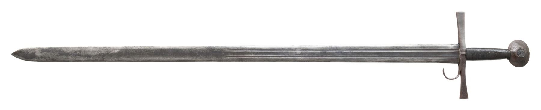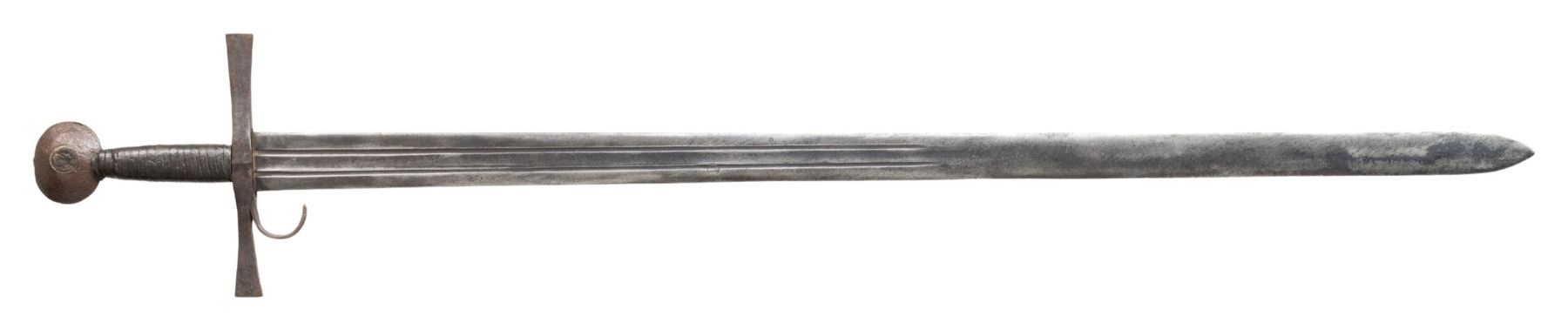 This exceptionally well done and authentic looking European medieval broadsword may be a Victorian copy. Nonetheless, it is well executed and of a form and style known to have been used in medieval Europe. The overall length of the sword is 40 5/8" with a 35" central fullered blade with a secondary fullers above and below. The blade has two half moon talismans stamped on each side. Flattened iron crossguard with a hook below one arm. Leather wrapped grip and a 2 1/4" disk pommel with a Roman coin at the center of each side. Both coins appear to be of the Constantine Period. CONDITION: blade has a lightly cleaned dark gray patina. Crossguard and pommel also have a dark patina as do the two bronze coins. Grip is complete and shows light wear. PROVENANCE: Estate Collection of Nicholas Apergis. (02-24777/BF). NON-GUN. $750-1,500.