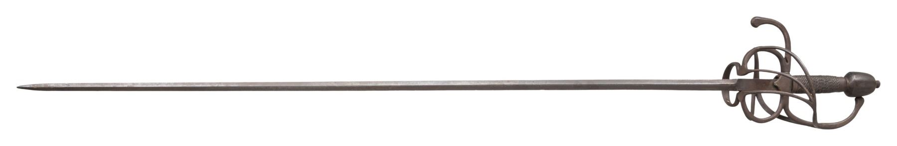 RAPIER. Overall length 46.5" with a 40.5" tapered diamond blade terminating with a 2.5" ricasso marked with a cross armorers mark. The guard comprises of double branching knuckle bow that attaches to the pommel and quillion block. The branches of the knuckle bow extend to the loop guard and counter guard which both attach to the side ring and flow into the arm branches. The arm branches attach to the upward sweeping crossguard with bulbous tip and knuckle bow. The grip has been re-wrapped with aged brass wire. CONDITION: The blade and guard have a lightly mottled dark patina. The blade shows some mild dings. Grip wrap shows minor carry wear. PROVENANCE: Estate Collection of Nicholas Apergis (02-24689/ZAL) $2000-3000