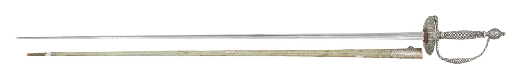 WITH SCABBARD.A very attractive silver hilted smallsword of the 18th century measuring 38" overall with a plain 31 1/2" triangular cross-section blade. The original red felt washer is intact. Slightly oval delicately pierced guard with equally delicate pas d'ane below a heavily embellished cross guard and pendulous drop quillon. The knuckle bow and melon shaped pommel are also heavily embellished with crosshatching a wound cord motif. The top of the knuckle bow has hallmarks that look like a crowned "O', a crowned sword with "G", and a head. The four-sided grip is solid silver and also covered in crosshatching. The seldom seen scabbard has a punch decorated silver throat with a ring and a frog stud for suspension. The body of the scabbard is fish skin cover thin leather or papier-mache. The silver tip is missing. CONDITION: blade retains most of its original finish with very slight staining. Hilt shows light wear overall. Scabbard is solid with a few minor scuffs and scrapes. (02-26070/BF). NON-GUN. $1,600-2,000.