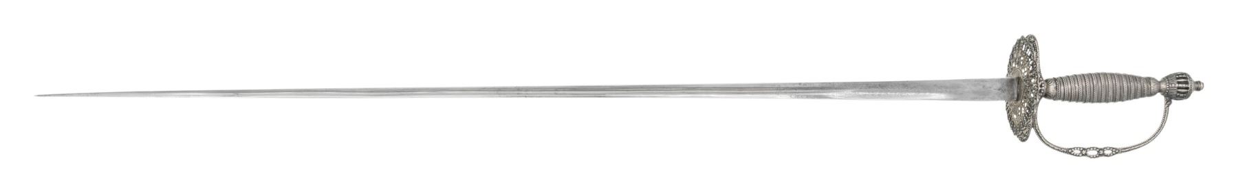 A gorgeous silver hilted smallsword of the 18th century measuring 38" overall with a plain 31 1/4" triangular cross-section blade with foliate etching over the first 8 1/2". Slightly oval delicately completely pierced heavily decorated guard with delicate small pas d'ane below a heavily embellished cross guard featuring a central pierced star. and dual drop quillons. The knuckle bow and crown shaped pommel are also heavily embellished and pierced. The base of the pommel has one discernable hallmark that is a loin passant. The grip is silver wire wrapped sheet silver. CONDITION: blade boasts an attractive light gray finish with easily visible etching. Hilt shows light wear overall. (02-26069/BF). NON-GUN. $1,200-1,600.