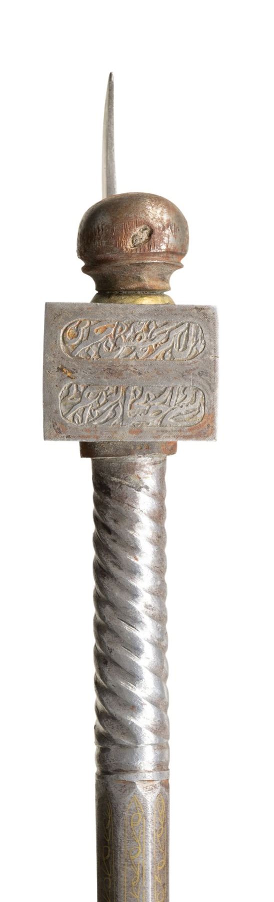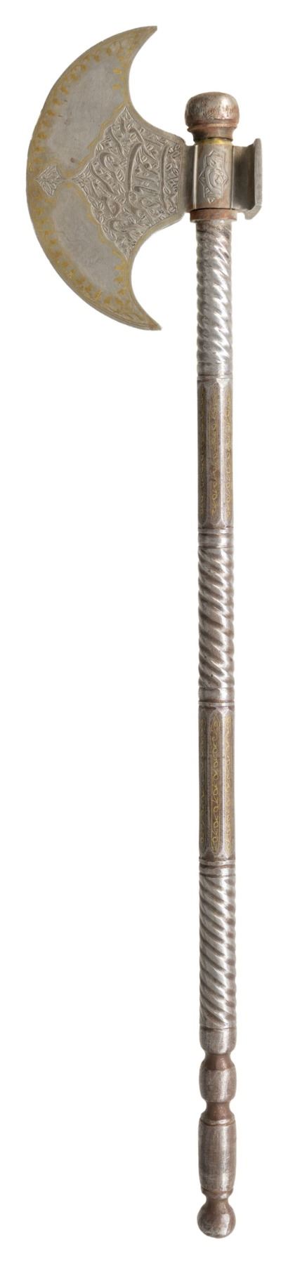 Approx. 27" overall. Head has hand engraved floral motifs along with gold floral scroll gilding. The staff has 3 sections of spiral fluting along with vine type gold gilding. CONDITION: axe has a gray appearance overall with patina & light marks. (02-25833/MD). $300-500.