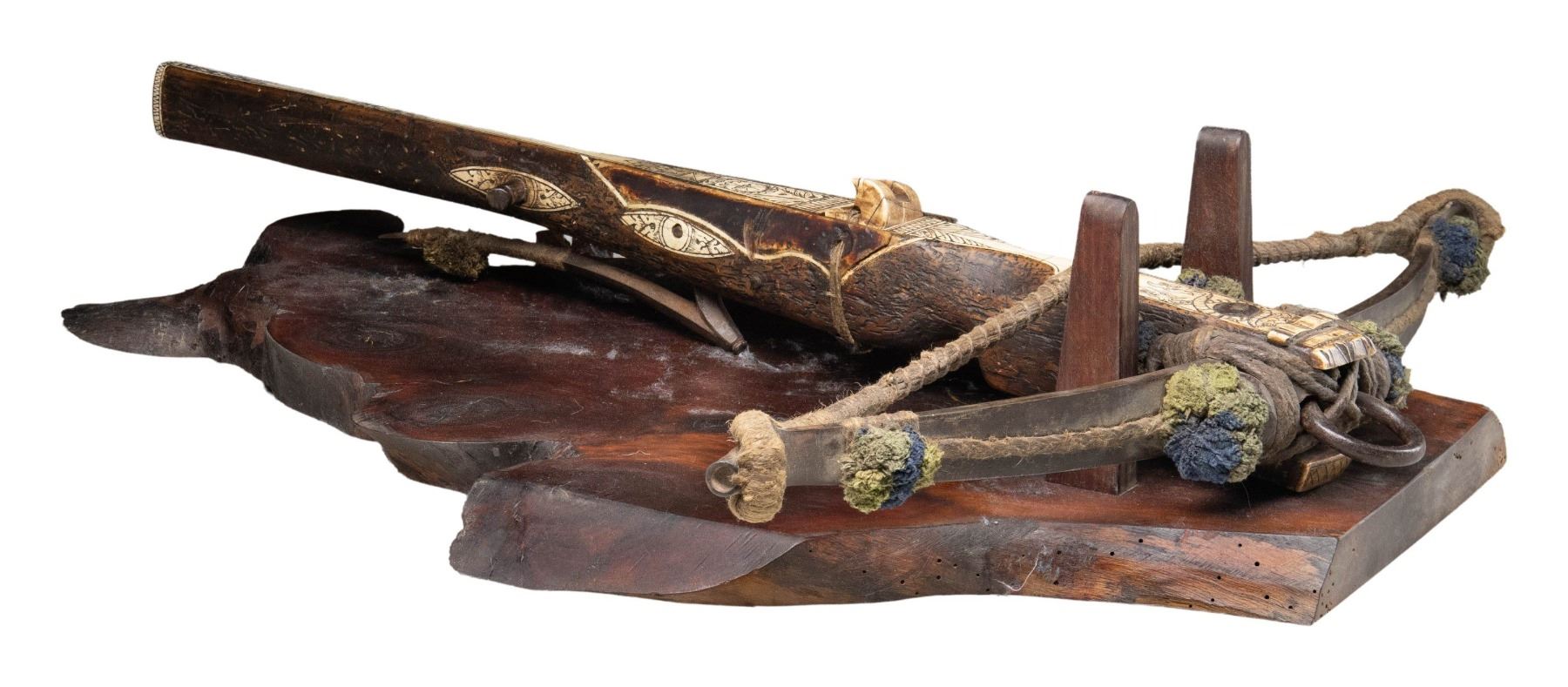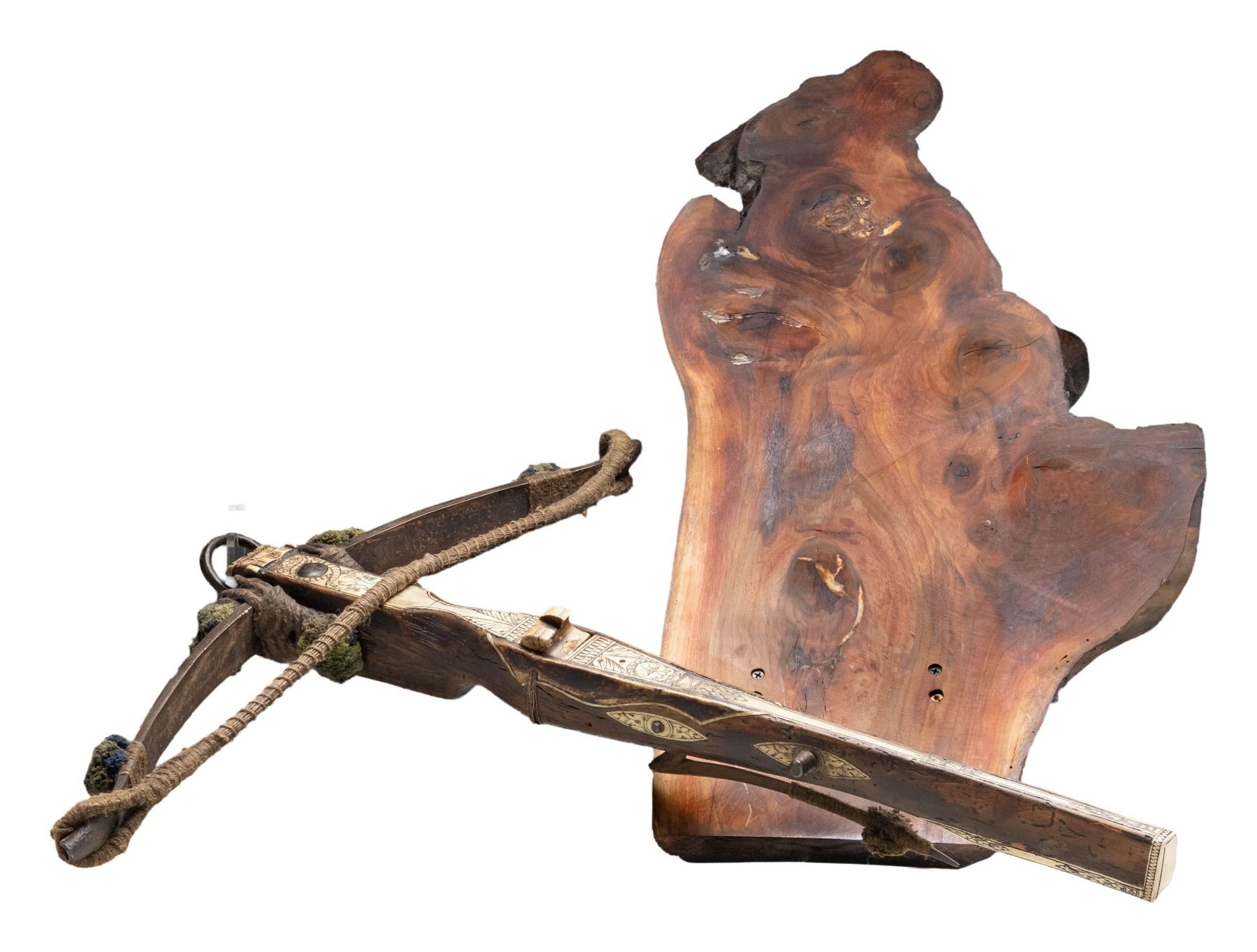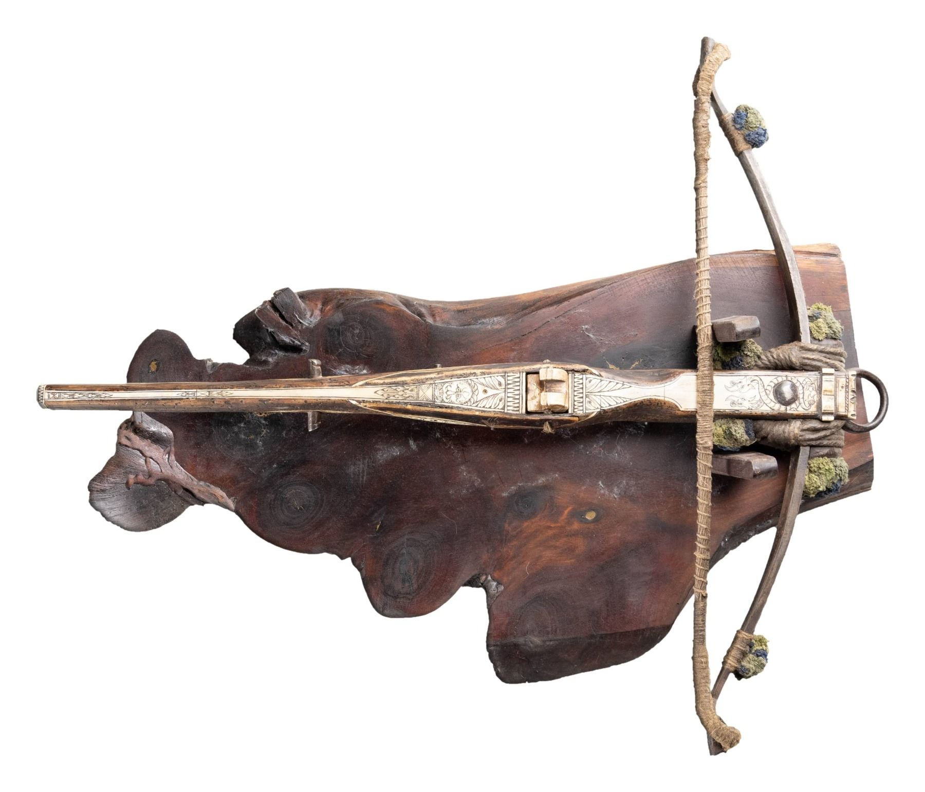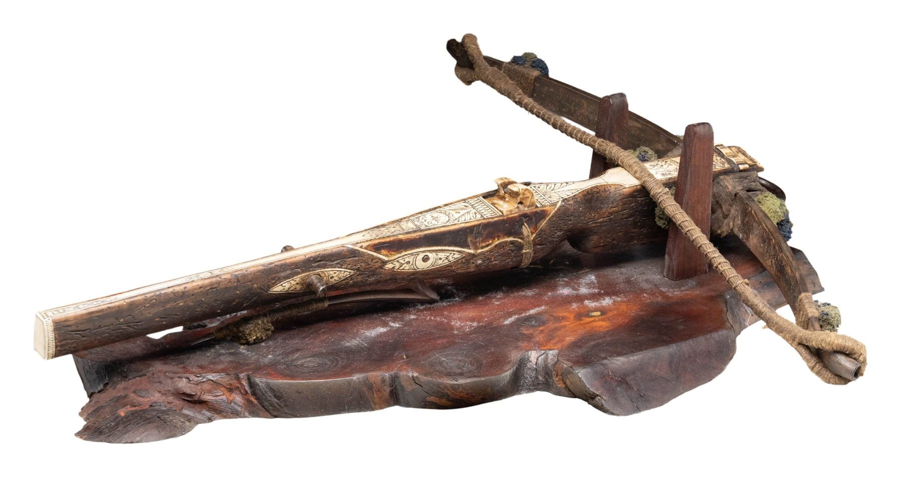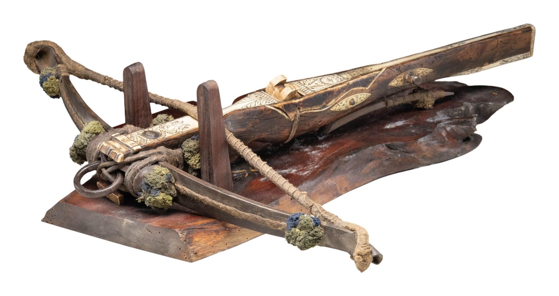 WITH STAND. Overall: 29.75". Steel prods measures 25.25" wide with 1/4" woven cloth string, 4 green & blue cloth dampers. Walnut stock held to bow by rope with a provision for iron loop at front. Stock has large finely carved bone inlay on top with additional bone inlays at tip, sides & butt. Motifs on top include 2 interlocking dragons & "Man-in-the-Moon". Steel lever acts as trigger for bone latch. 2 Steel studs on sides of stock for drawing string. Also included is 28.75" long walnut stand. CONDITION: the crossbow & stand appear good, intact overall with patina on steel parts along with side inlays separating from stock. PROVENANCE: Estate Collection of Nicholas Apergis. (02-24797/MD). $3,000-5,000.