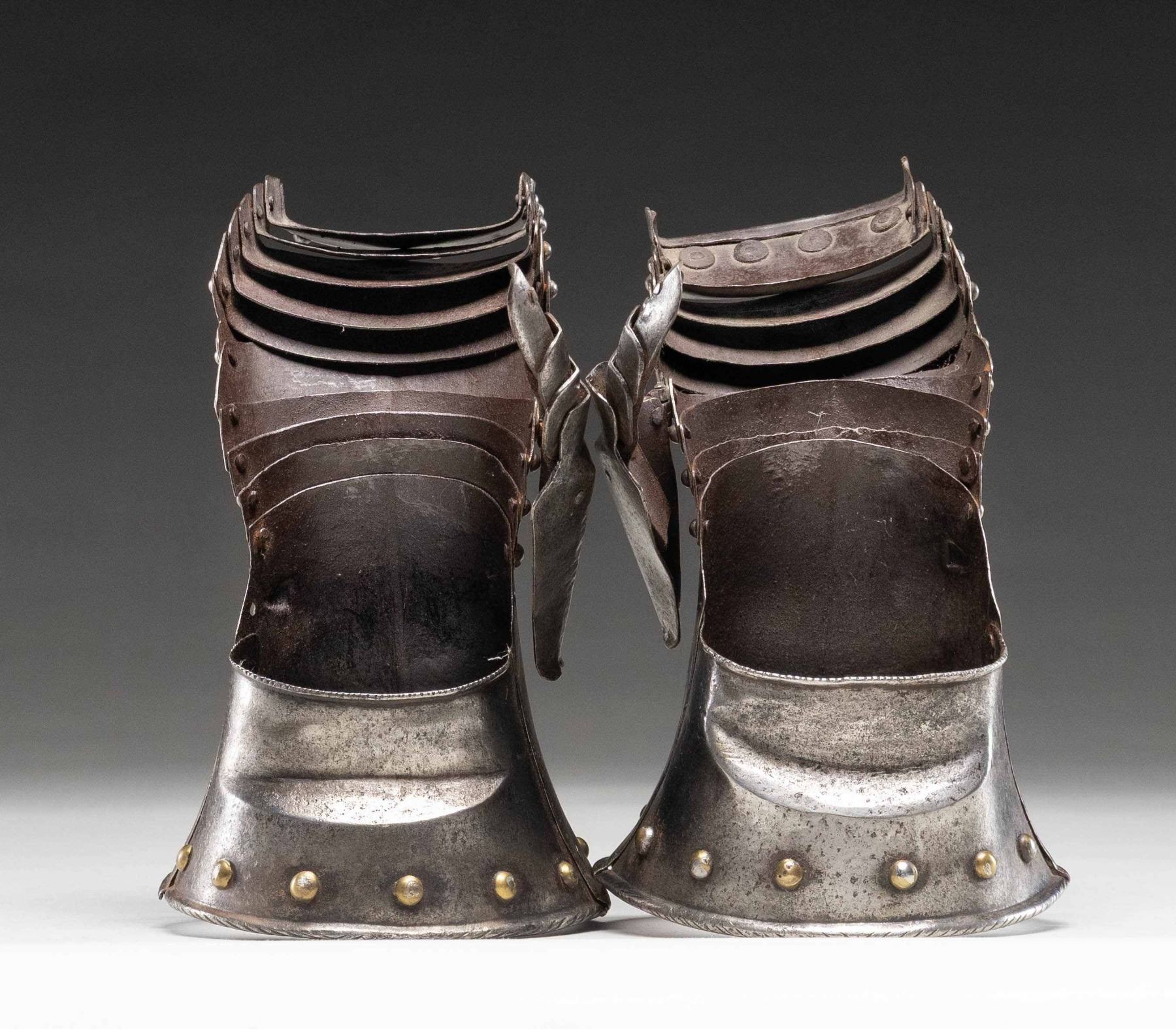 A fine matched pair of iron mitten gauntlets of German origin, possibly from Nuremberg. Each gauntlet is approx 10 1/2" in length and 5 1/4" at the peaked cuff. There are numerous brass rivets at the edge of the cuff with a gadrooned edge. There are five rivet hinged segments above the serrated knuckle bar and four rivet hinged segments below. The thumb piece is made from four plates riveted to leather and swivels on a hinge. CONDITION: iron has a lightly cleaned medium gray patina with scattered light pitting. The interior of the gauntlets have a more heavily oxidized appearance. PROVENANCE: Estate Collection of Nicholas Apergis. (02-24655/BF). NON-GUN. $1,500-2,000.