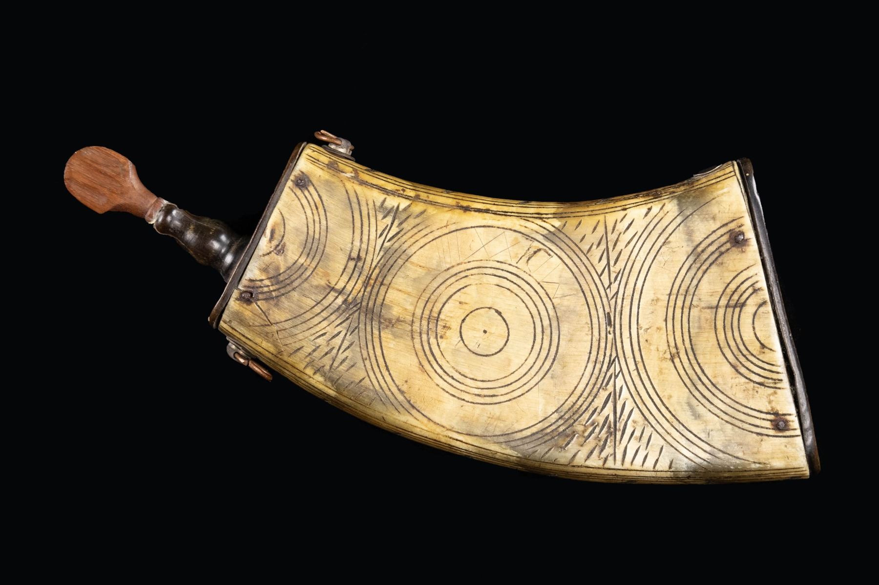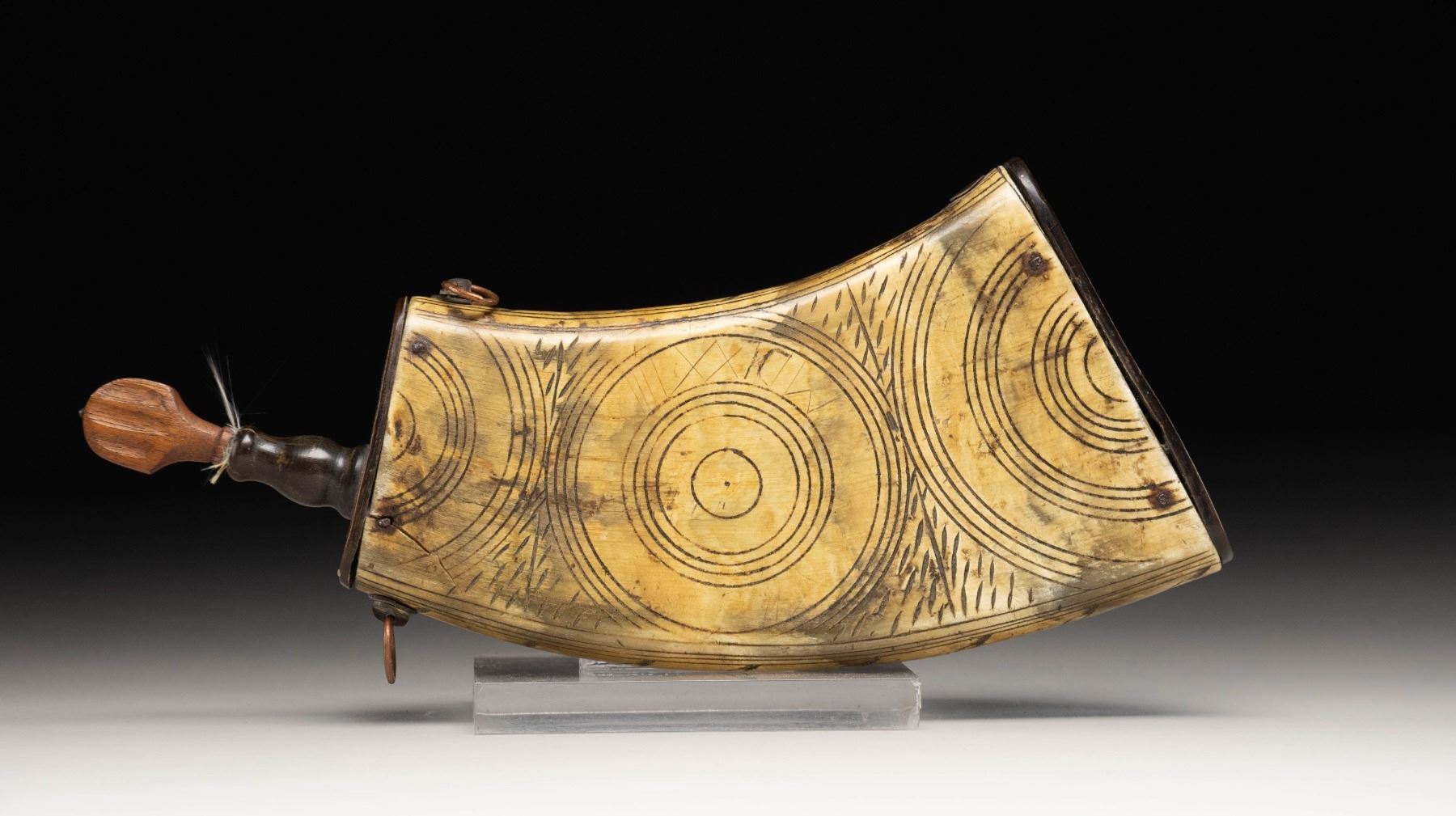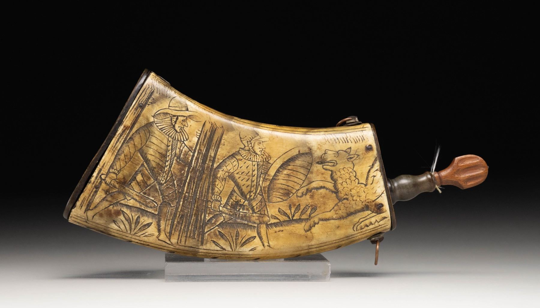 Lot 4456 GERMANIC MOULDED POWDER HORN NICELY SCRIMMED.