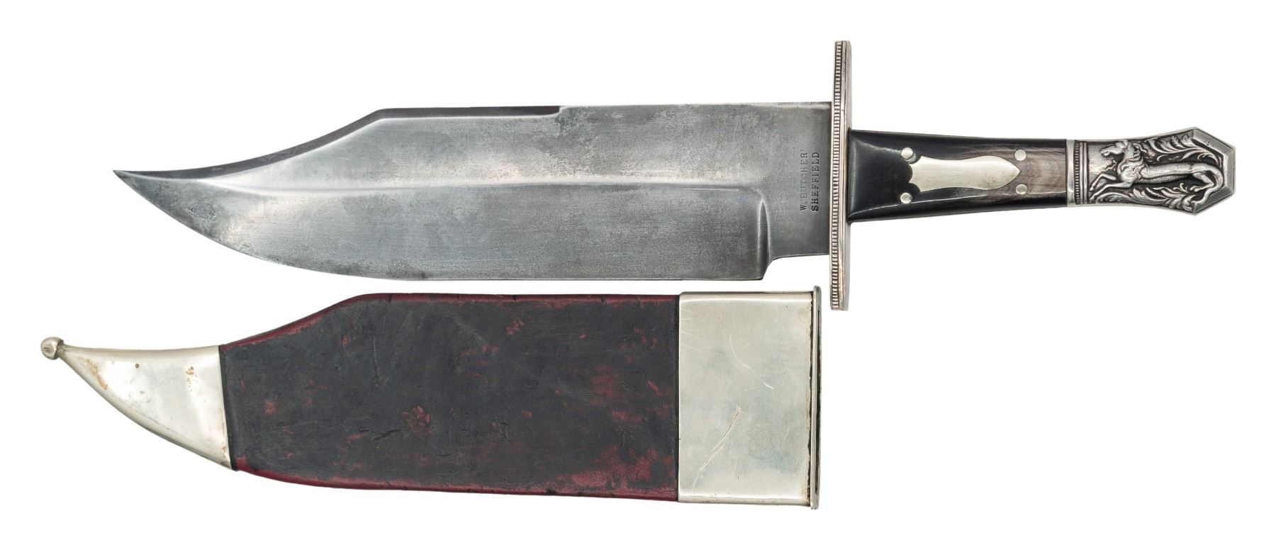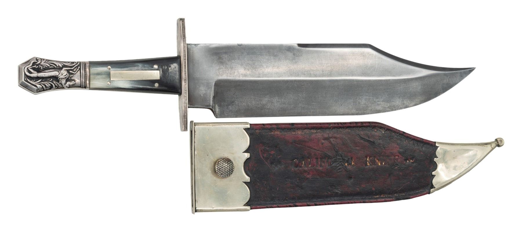 16" overall, 10.5" very wide clip point, half horse-half alligator cast pommel, German silver mounted sheath gold embossed "CALIFORNIA KNIFE". CONDITION: fine as current made. (02-25219/JS). NON-GUN. $200-400.