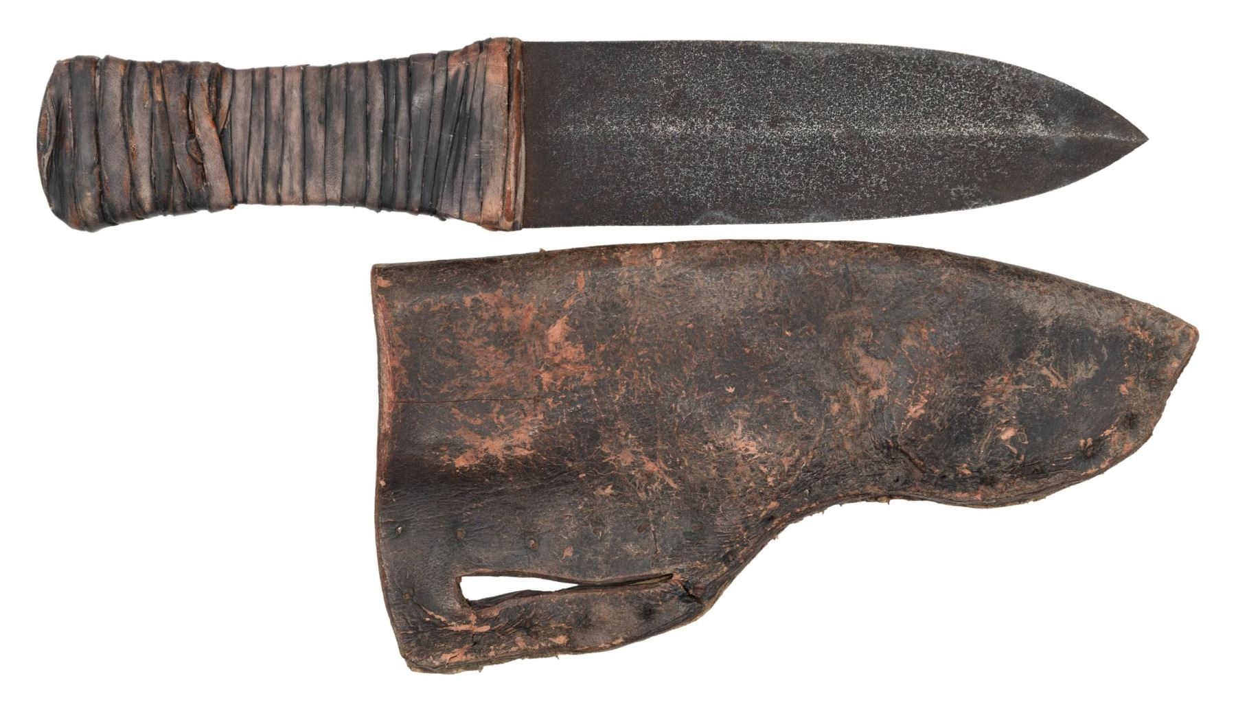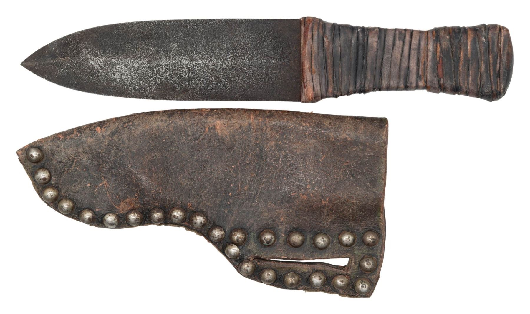KNIFE & TACKED SHEATH. 12" overall, 7" double edged wide dagger blade, full tang, cord wrapped handle, folded tacked & slotted harness leather sheath. CONDITION: good overall, pitted blade, sheath scuffed and one break at slot. (02-25227/JS). NON-GUN. $400-600.