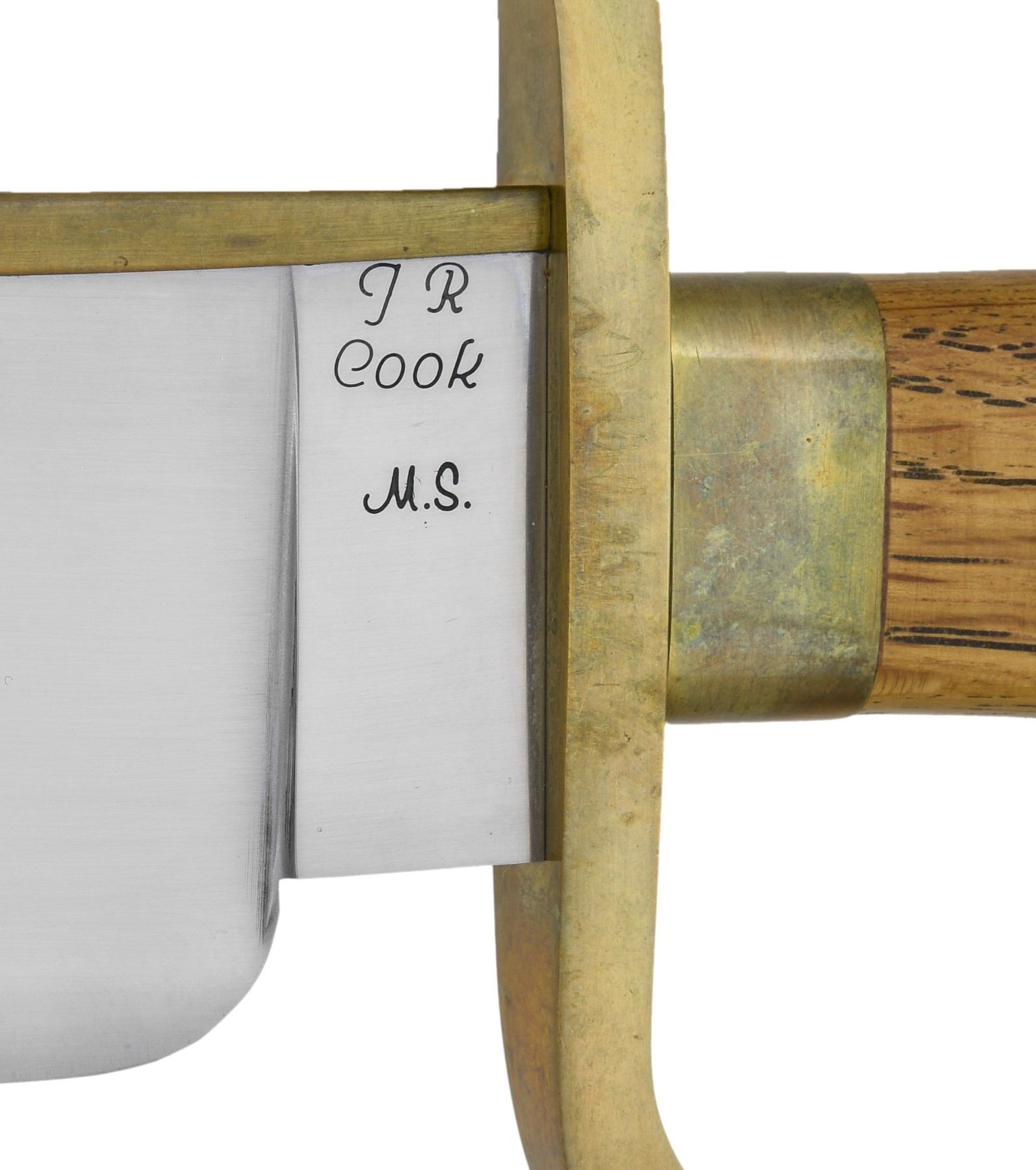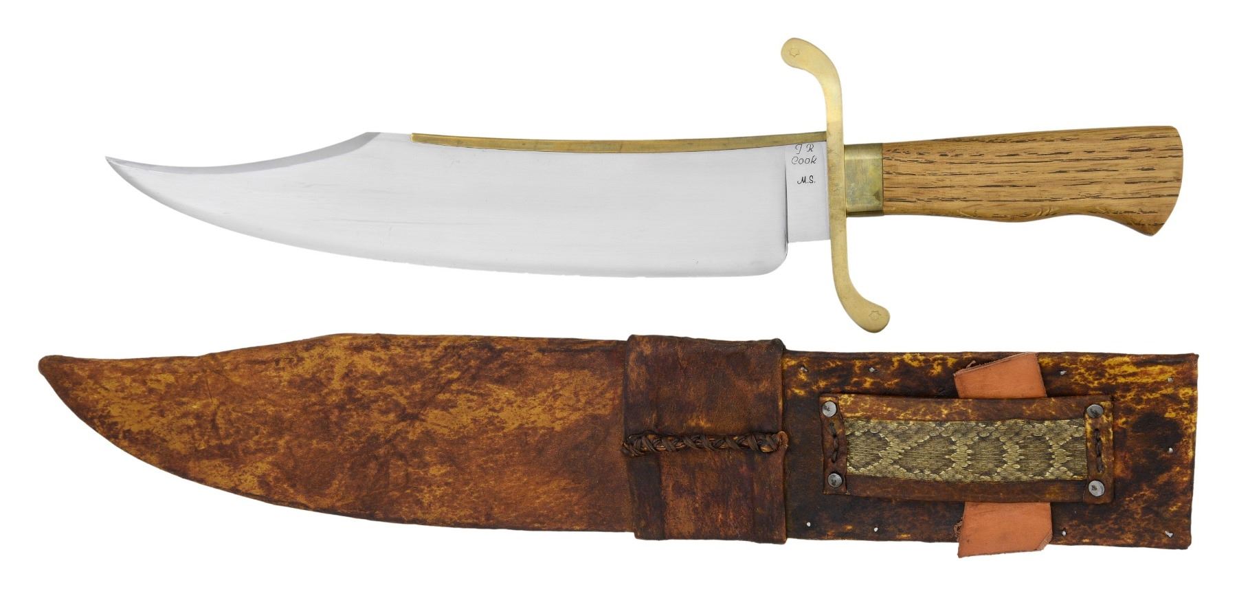 COOK. 19.5" overall, 13.5" clip point with brass trimmed top edge, 2.5" wide, 5" sharpened clip, signed "JR COOK, M.S.". 5.5" "S" shaped crossguard, sculpted wood handle, rawhide and rattlesnake sheath. James R. Cook is master cutler in Nashville, TN. His website states his waiting list is one to 2 years for custom work. CONDITION: excellent, bright high polish blade, sheath is fine. (02-25291/JS). NON-GUN. $2,000-3,000.