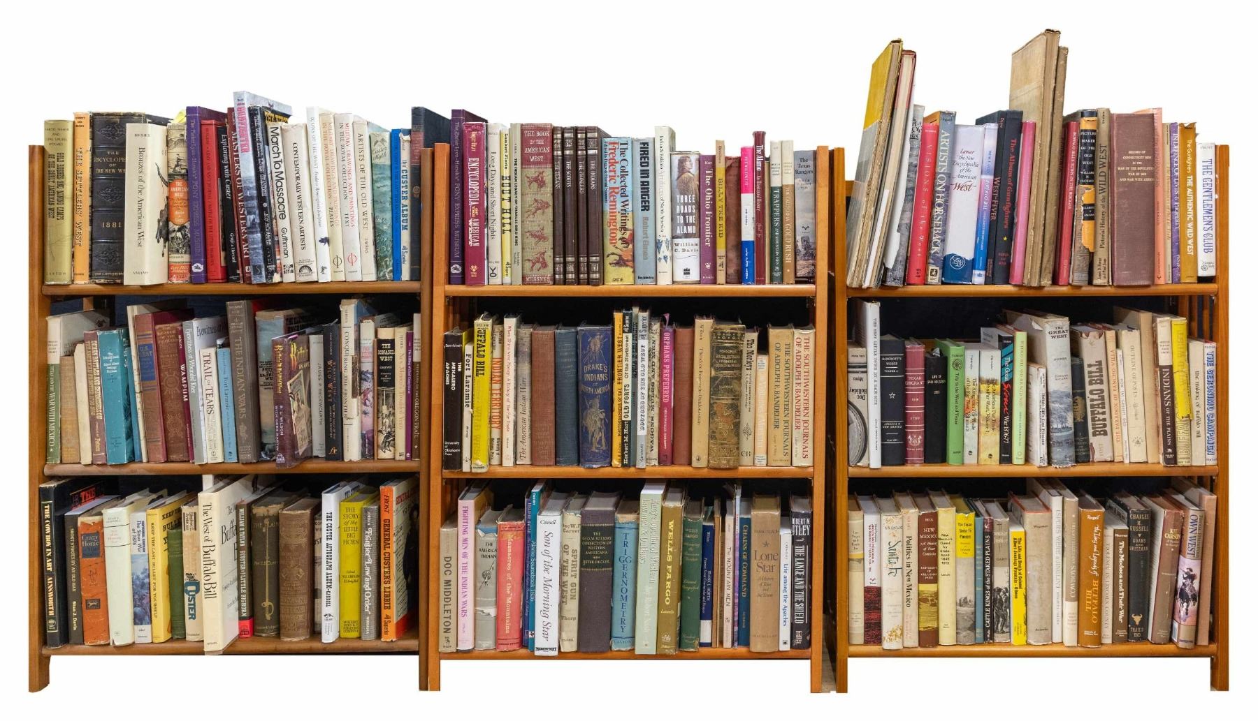 Over 200 books & references on Custer, Texas Rangers, native Americans, Mountain Men, Western settlers, forts, Wells Fargo, Western art & artists, and more. (02-24521-10/JS). NON-GUN. $1,000-3,000.