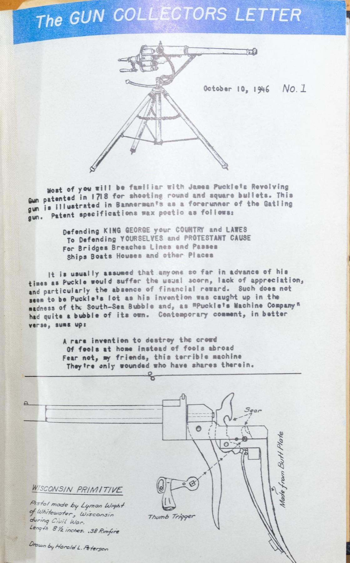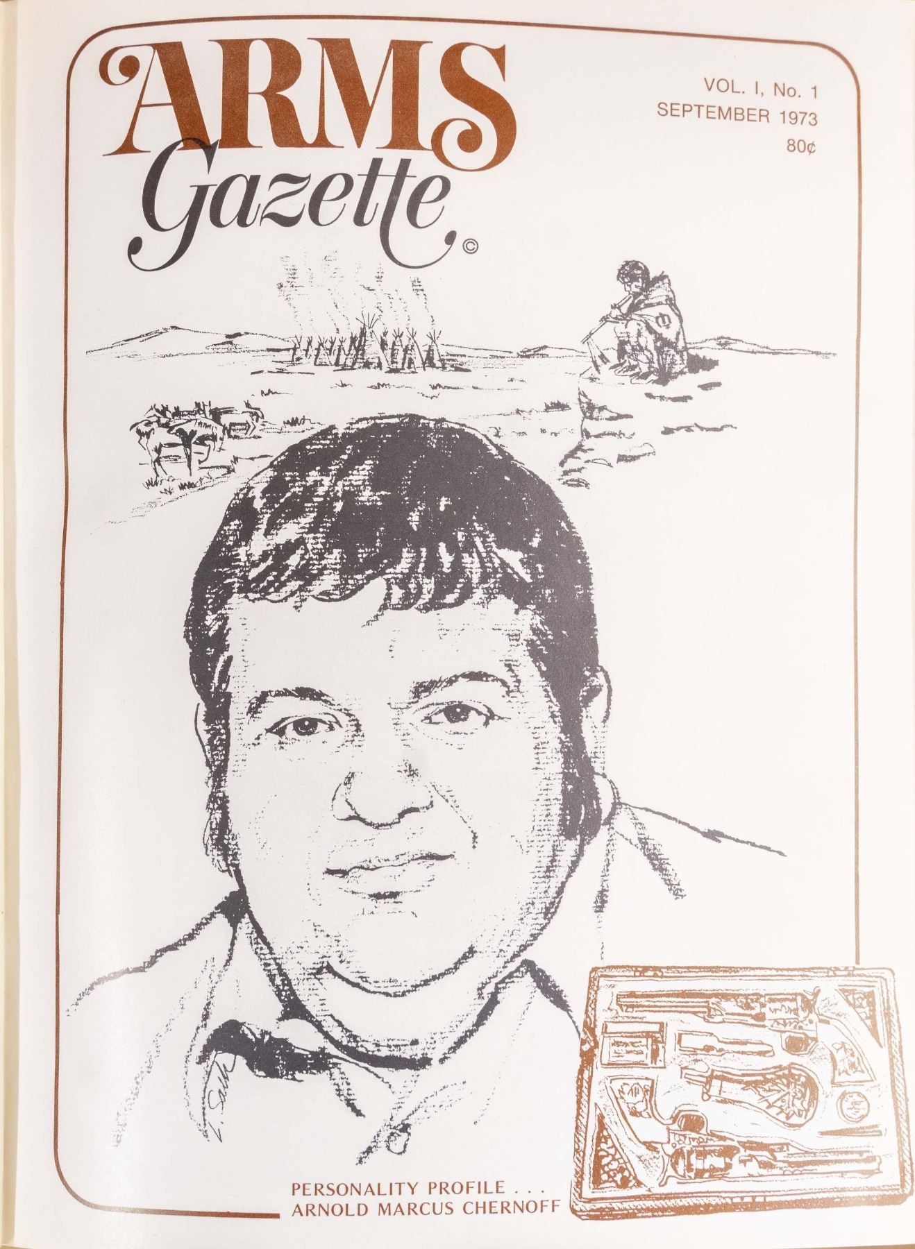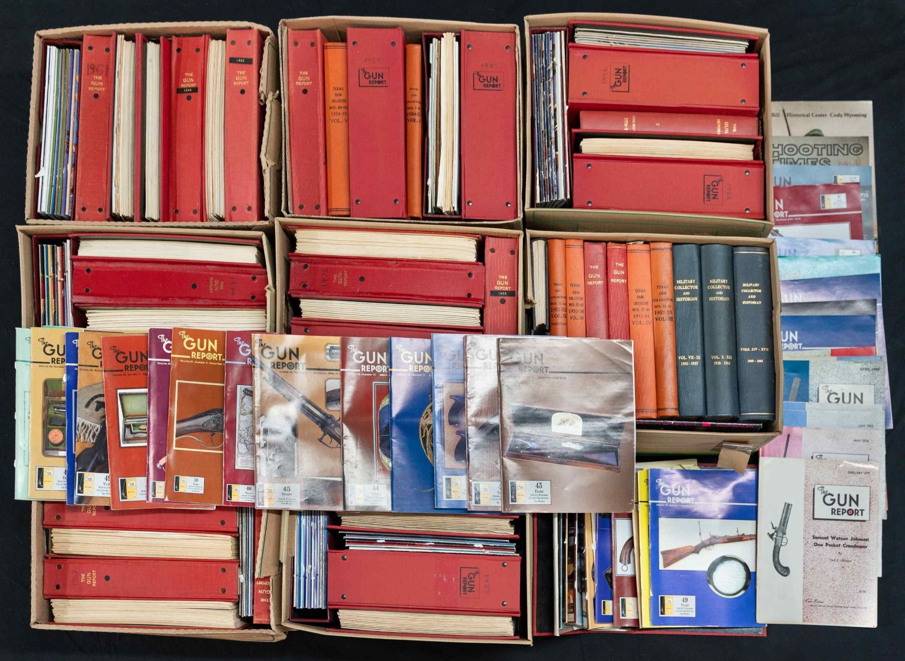COMPLETE BOUND SETS OF SOME IMPORTANT EARLY GUN MAGAZINES, including "THE GUN COLLECTOR" 1946-1953, all 45 issues bound in 3 volumes; "TEXAS GUN COLLECTORS BULLETINS", the first 6 years 1950-1956, 68 issues in 6 bound volumes; "MILITARY COLLECTOR & HISTORIAN", first 20 years, 80 issues bound in 5 volumes; "ARMS GAZETTE" all 24 issues of this excellent Beinfeld publication only published 1973-1974. There is also a set of "GUN REPORT" 1955-2011, 672 issues, early years in annual binders, not collated but probably complete. Many loose copies of other periodicals, dealer, catalogs, and more. (02-24521-8/JS). NON-GUN. $500-1,000.