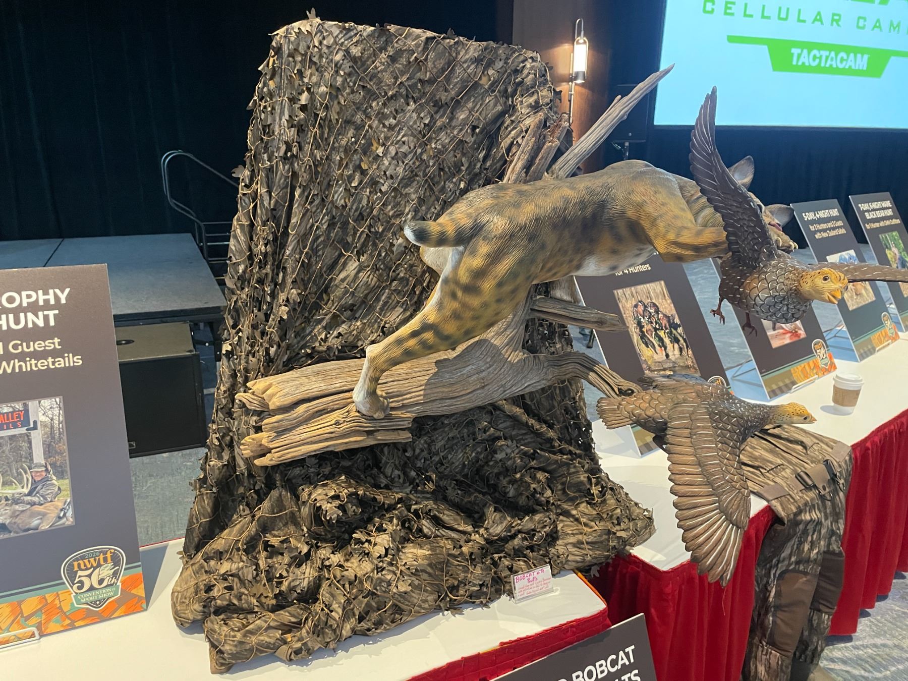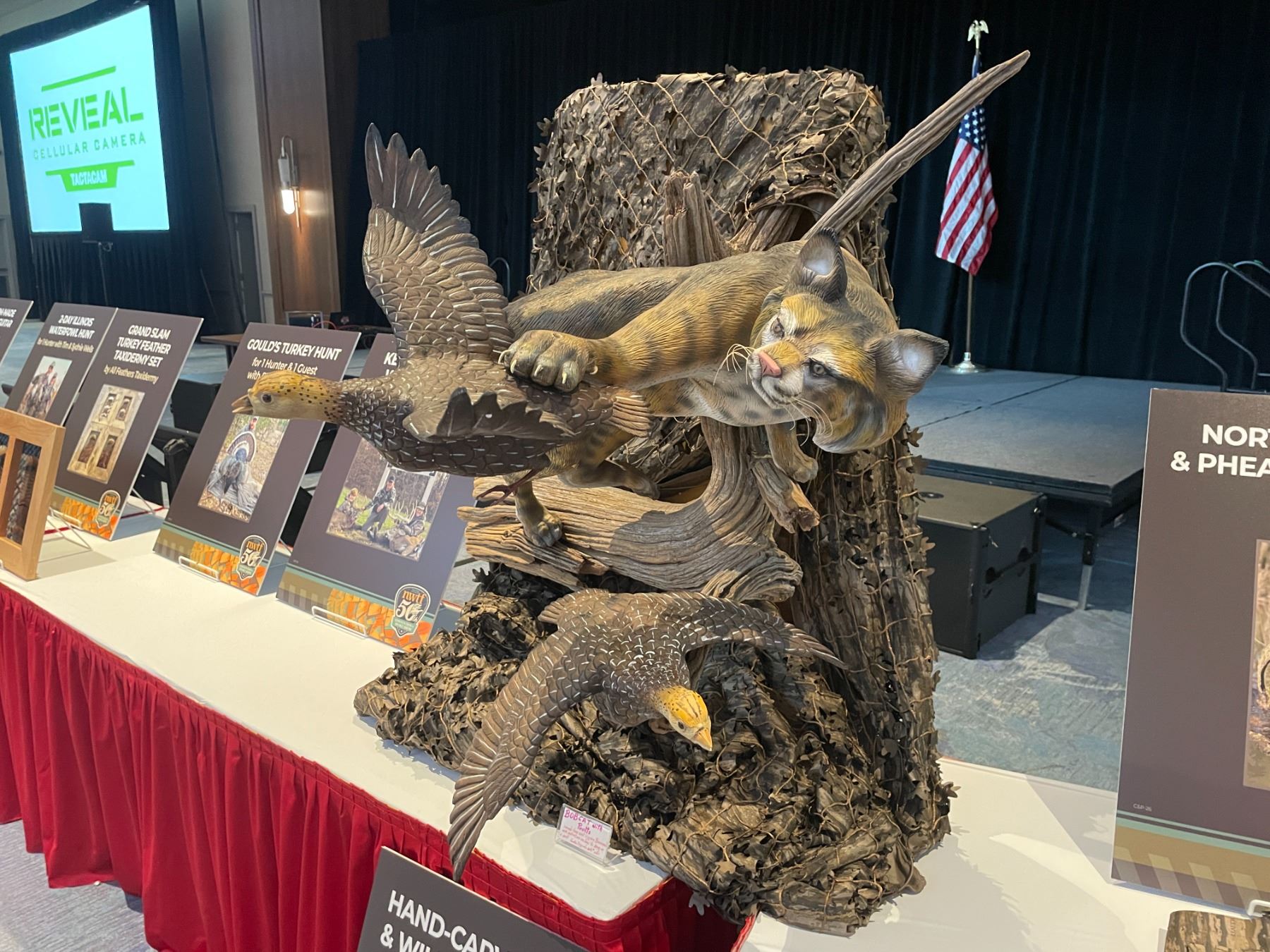 Don’t miss out on this opportunity to own this beautiful hand carved Bobcat flushing two wild turkey poults!