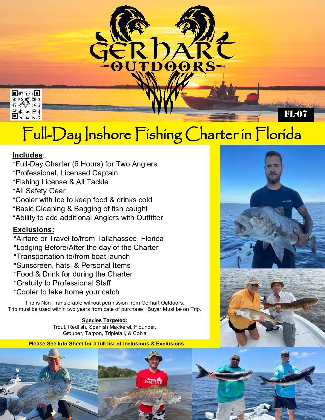 Fish species we target are: Trout, Redfish, Spanish Mackerel, Flounder, Grouper, Tarpon, Tripletail, and Cobia.