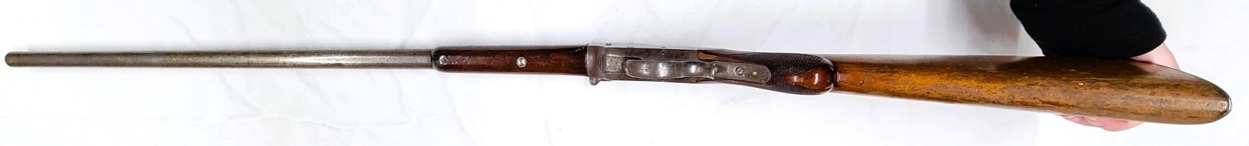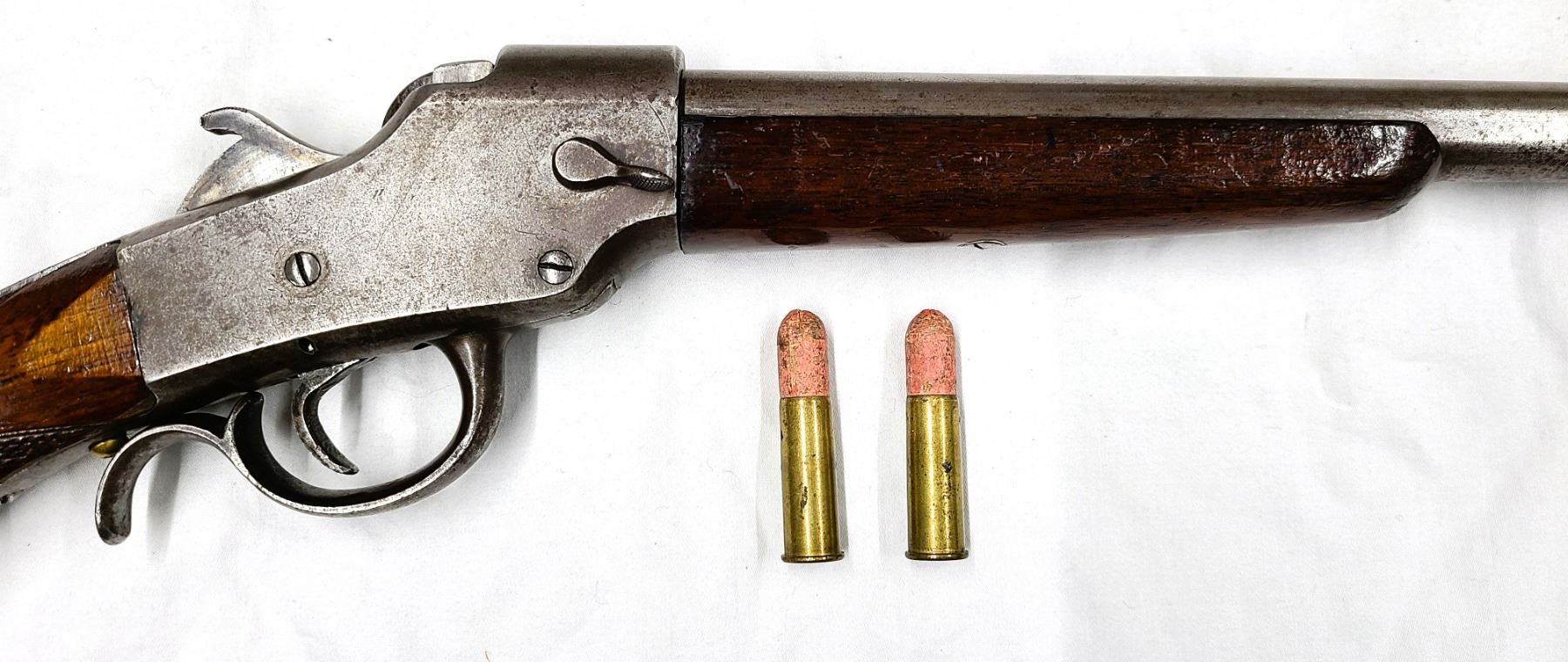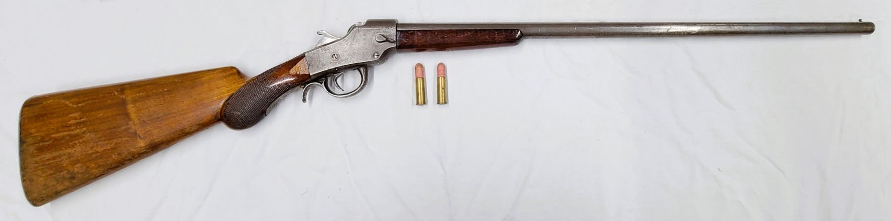 Listed is a Hopkins & Allen falling block smooth bore rifle which comes with 2 Rounds.
