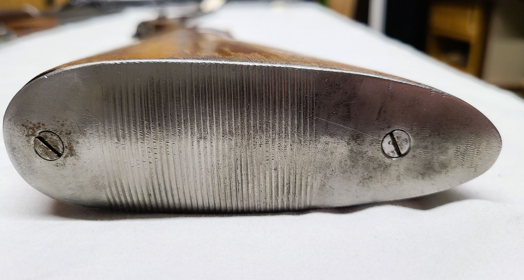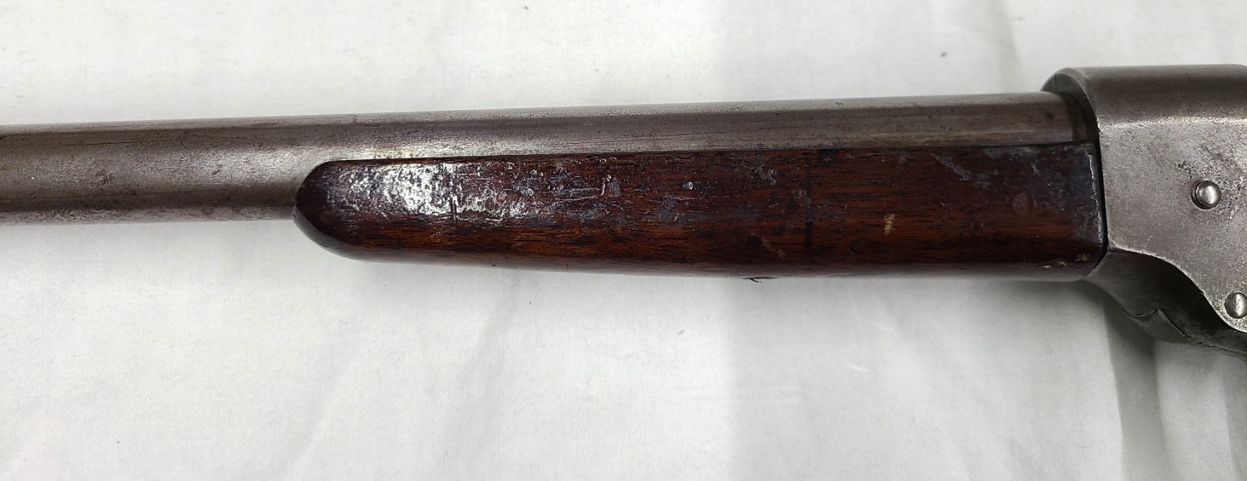 Barrel and receiver have 0 bluing left and with the metal exhibiting a gray patina with oxidation and