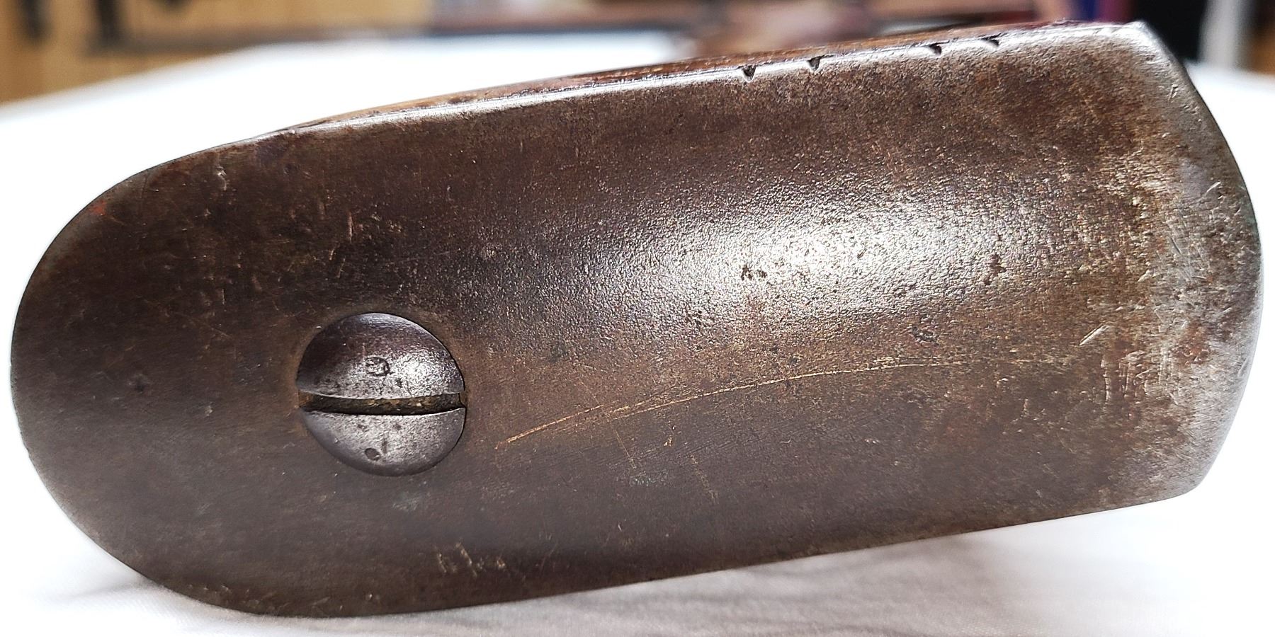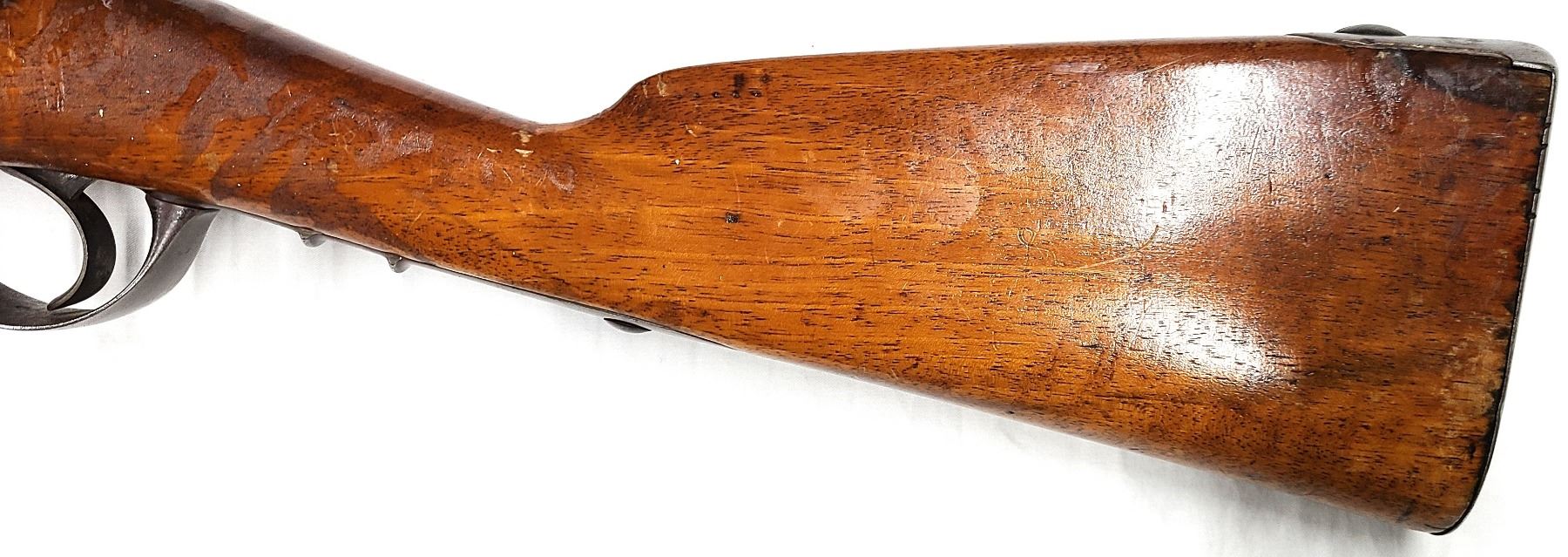 CONDITION: Steel is worn with arrears of rust spots. Bore is dark. Steel butt plate is original.