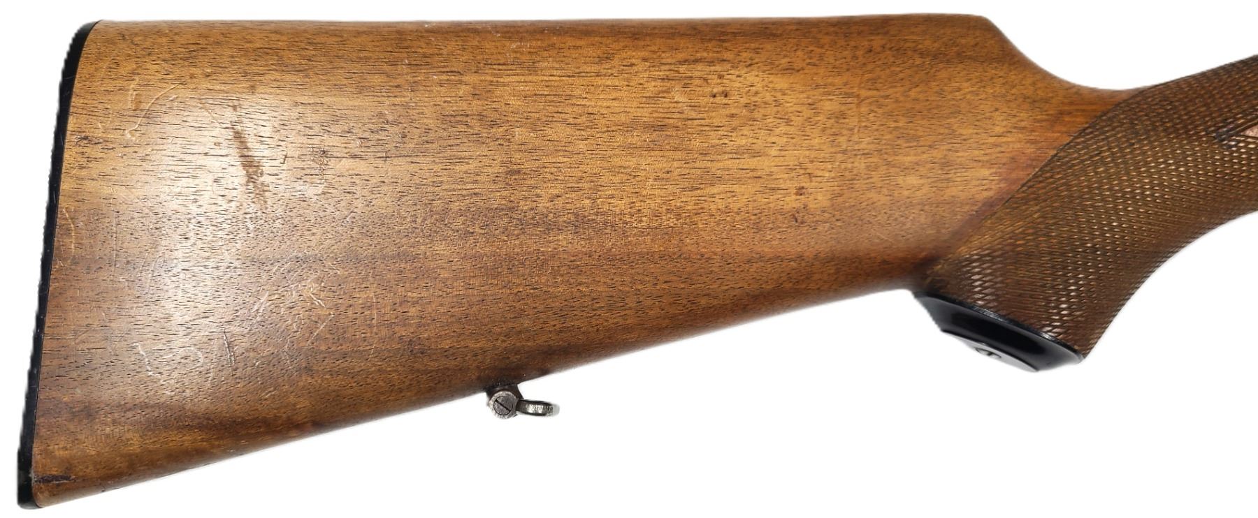 The solid, nicely checkered walnut stock has a satin finish and very few marks. (see pictures). .