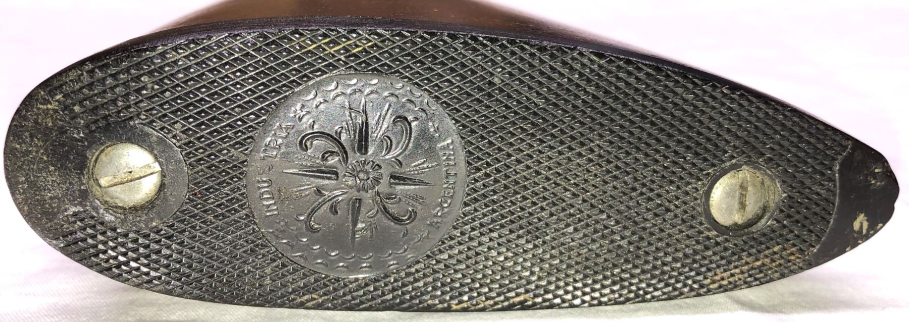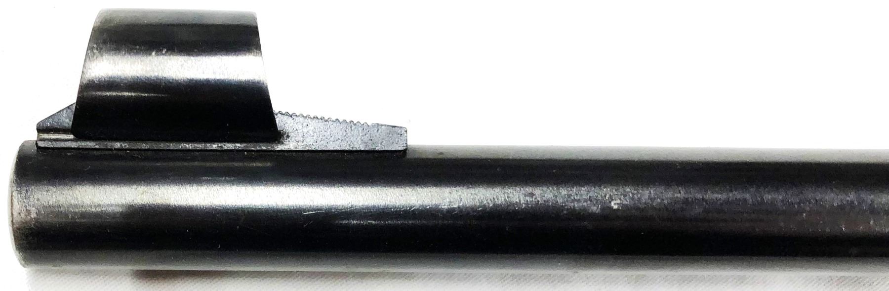 Metal shows few scratches, scuffs, rust specks on barrel and receiver. Bluing is at about 75%.