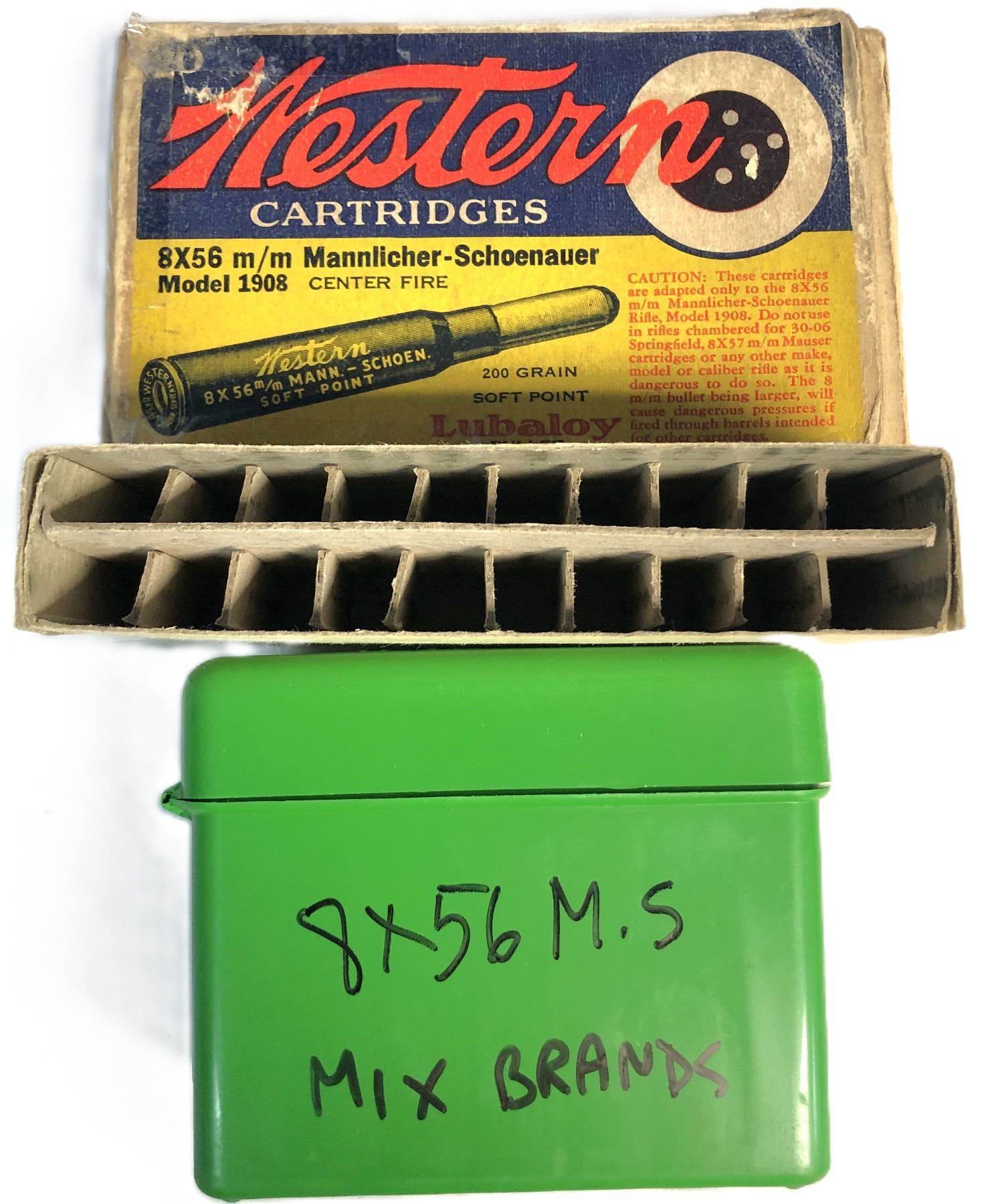 8 x 56 Mannlicher Schoenauer ammo mixed lot with empty Vintage 8 x 56 box