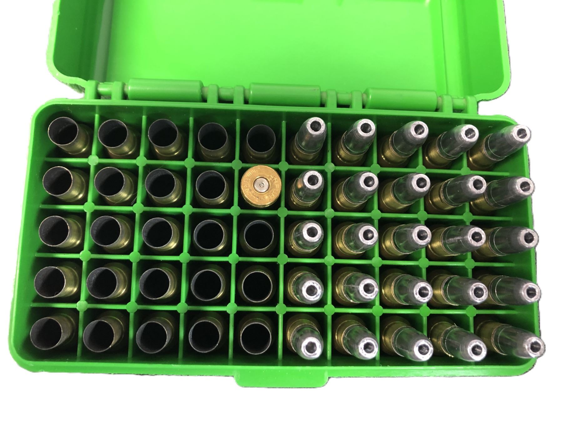 25 rounds and 25 brass in a green ammo case as shown