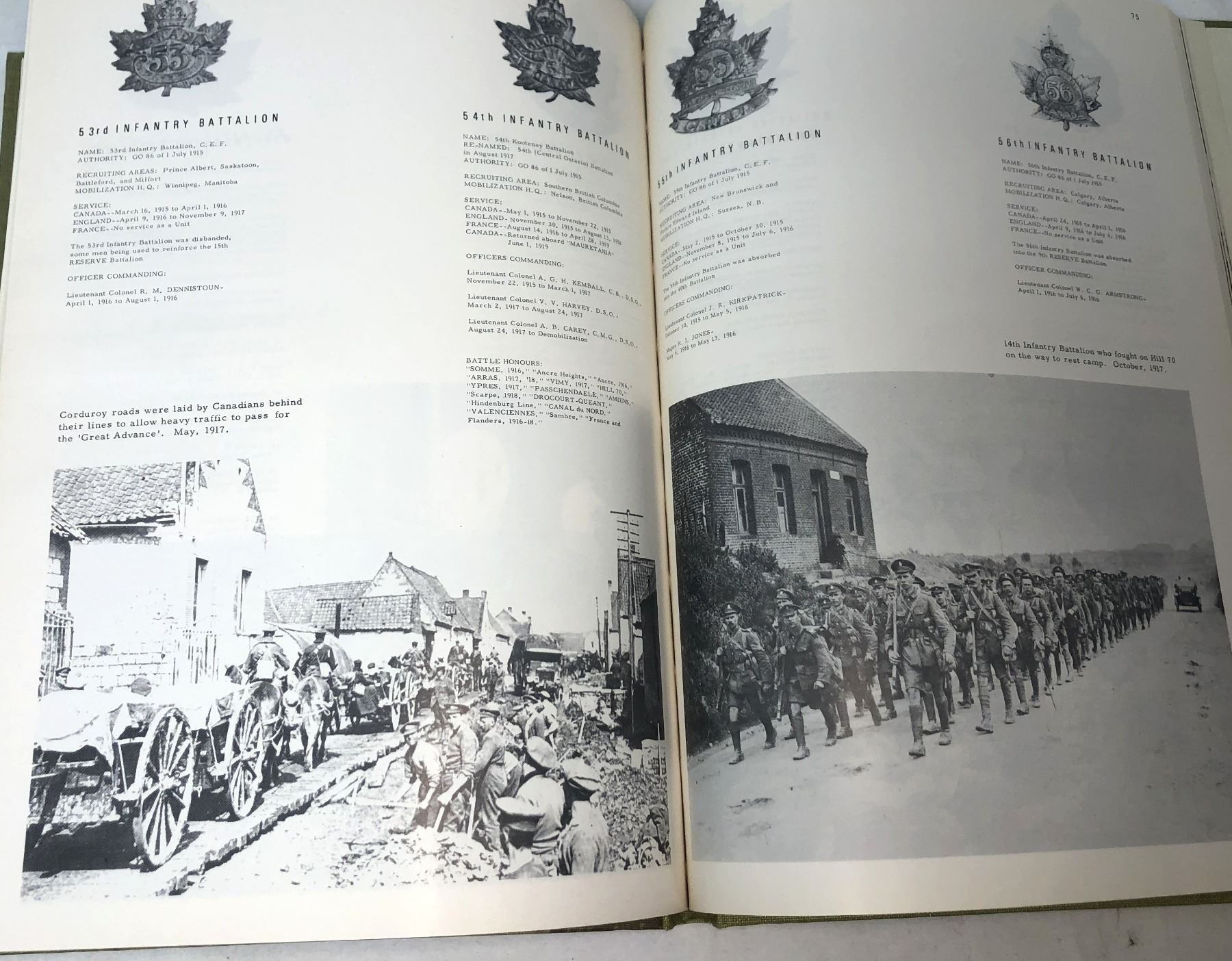 In depth listings of Canadian infantry involvment in WW1 with cap bages