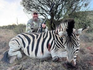 The package includes six trophy species: one warthog, one common blesbuck, two common springbuck, one zebra, and one black or blue wildebeest, shared among the hunters. Included are the services of a Professional Hunter, skinner, and tracker for the entirety of the hunting experience.