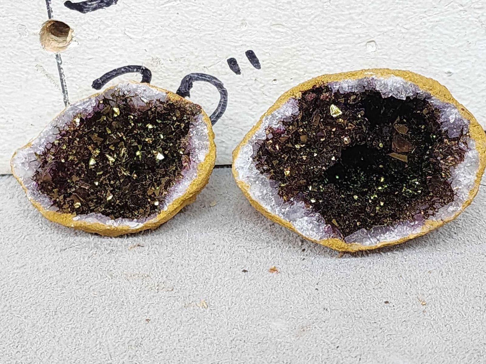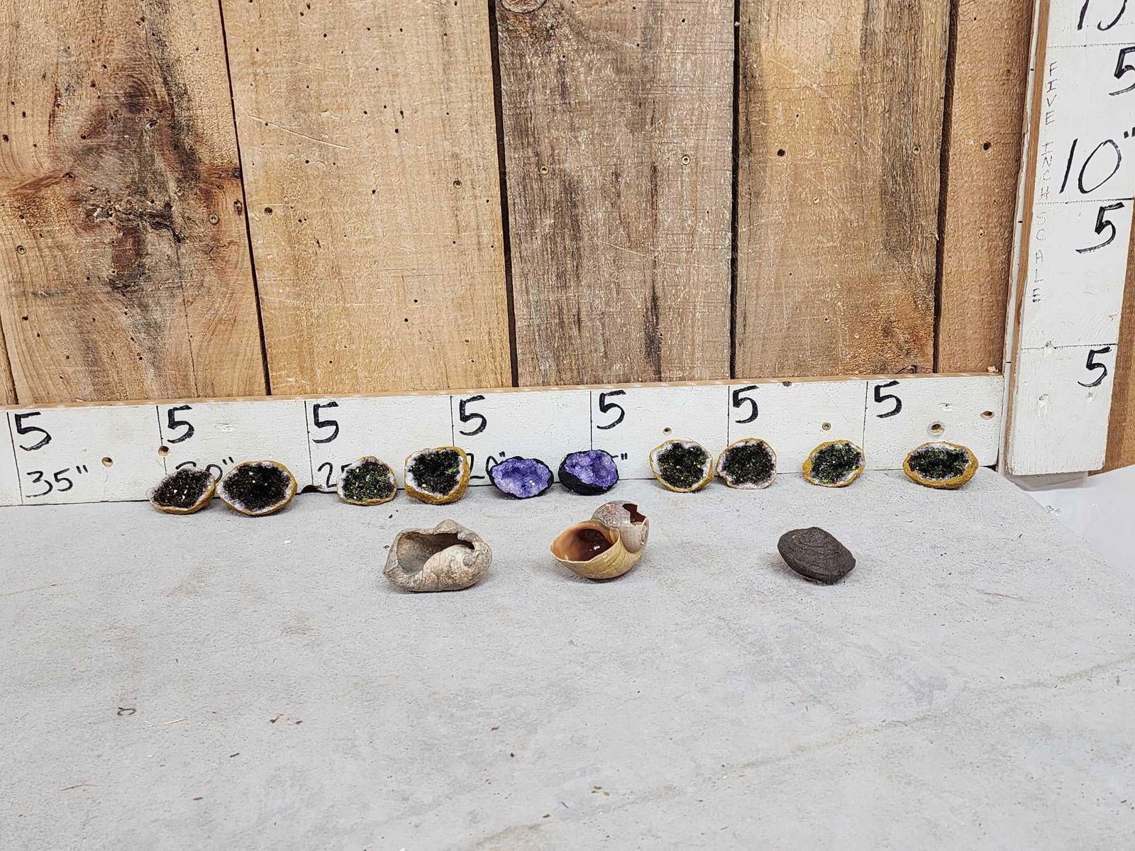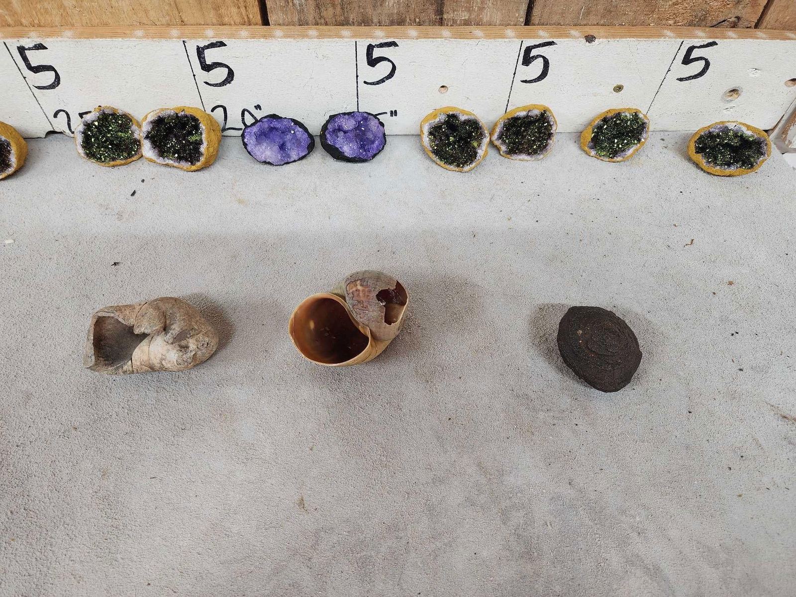 50.42 all split in half gorgeous colors with bonus 2 sea shells possibly coprolite fossil