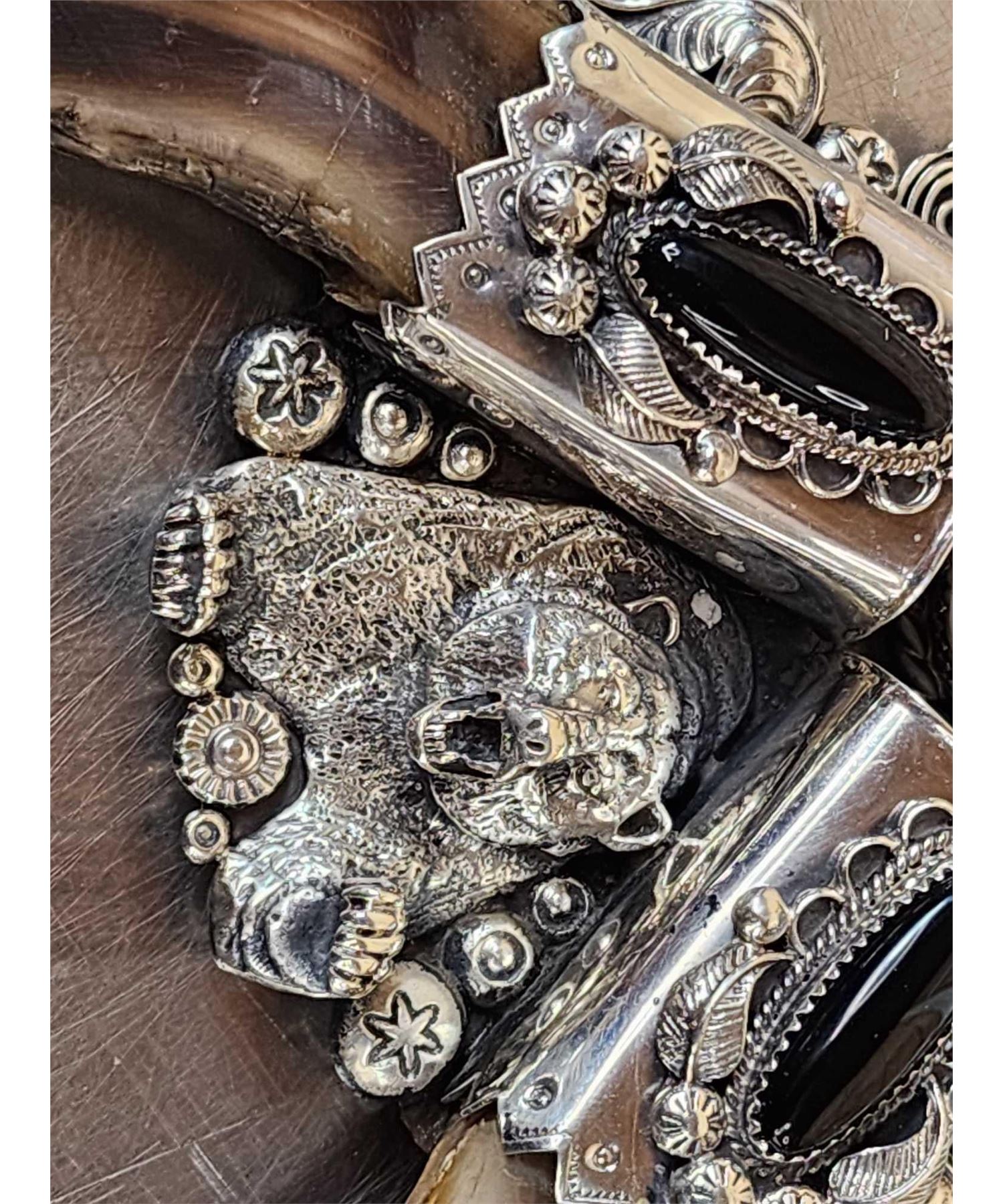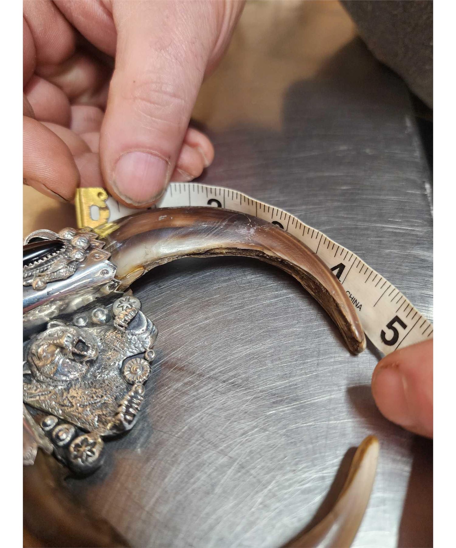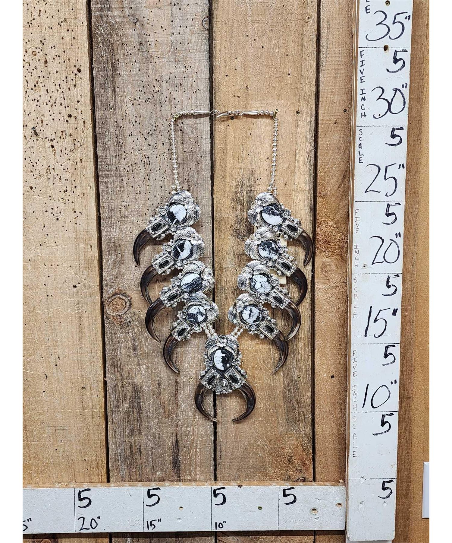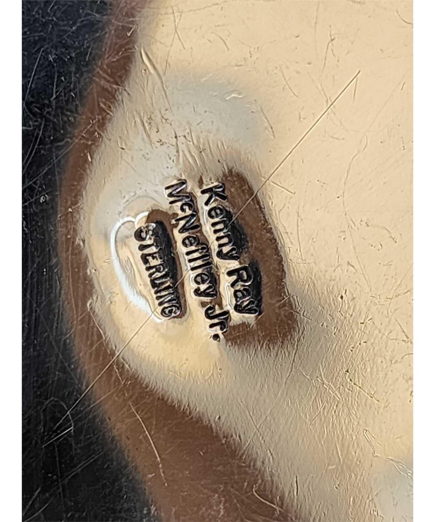 35.81 Unbelievable craftsmanship by NOW RETIRED artist Kenny Ray McNeilly Jr .We had the pleasure of talking with Kenny directly he indicated that there are VERY few piece of his artwork available for sale in his gallery there will be no more produced ! This true piece of art weighs 2.8 Lbs the weight is predominantly silver .Decorated with 10 Huge Alaskan Grizzly Bear Claws polished to a high sheen along with White Buffalo Turquoise Black Onyx stones .Take advantage of this opportunity to invest in this world class artwork for your collection!
