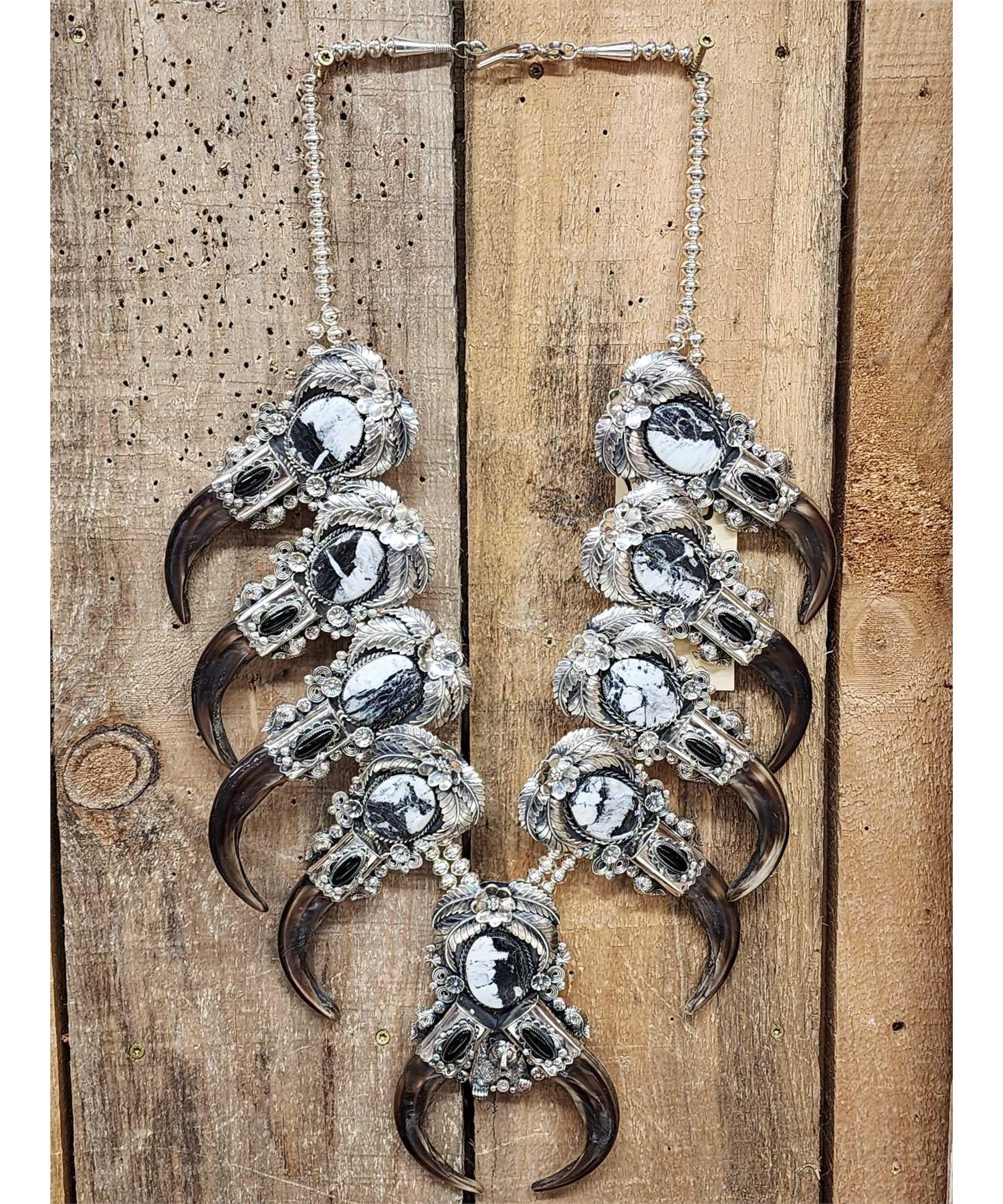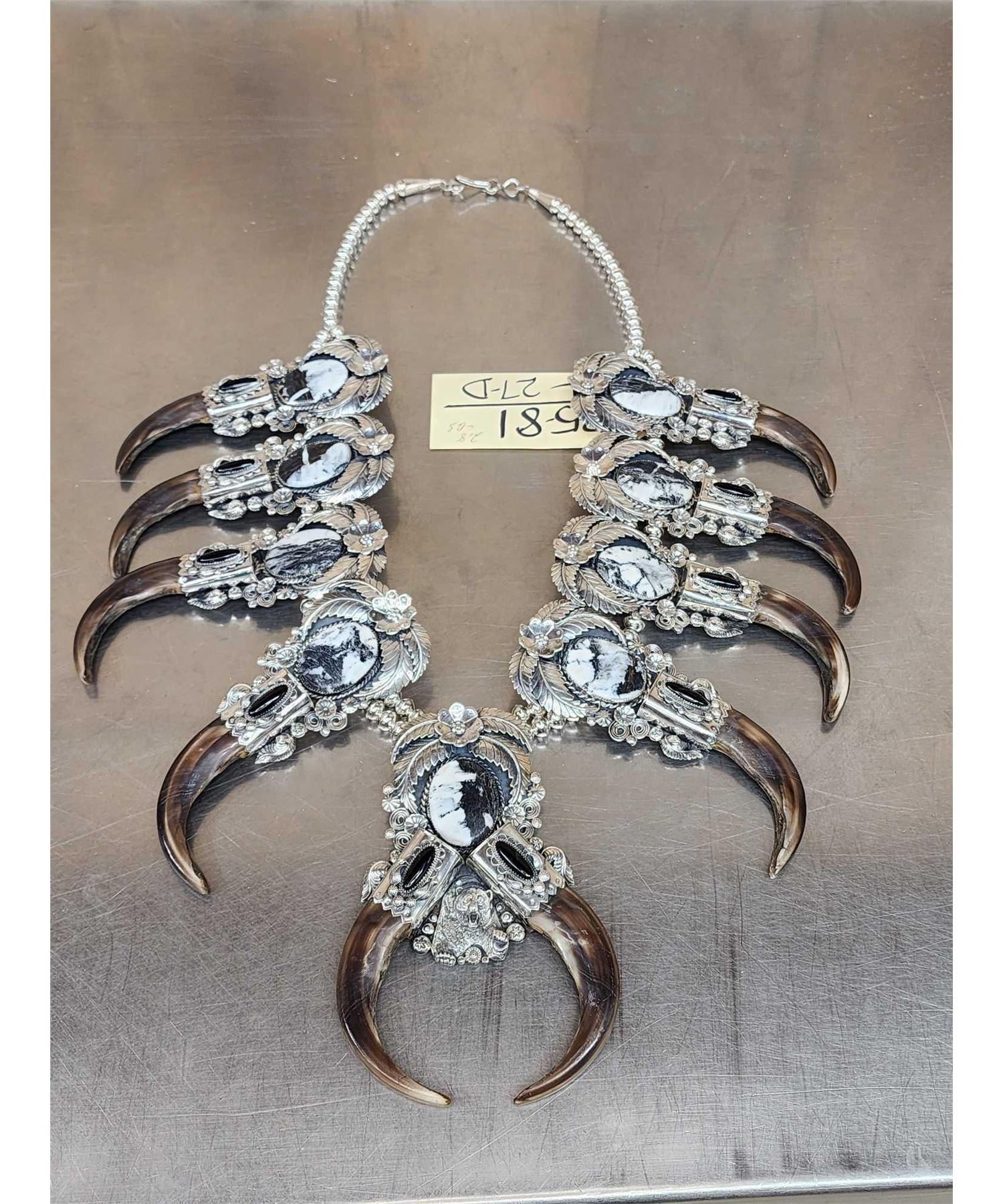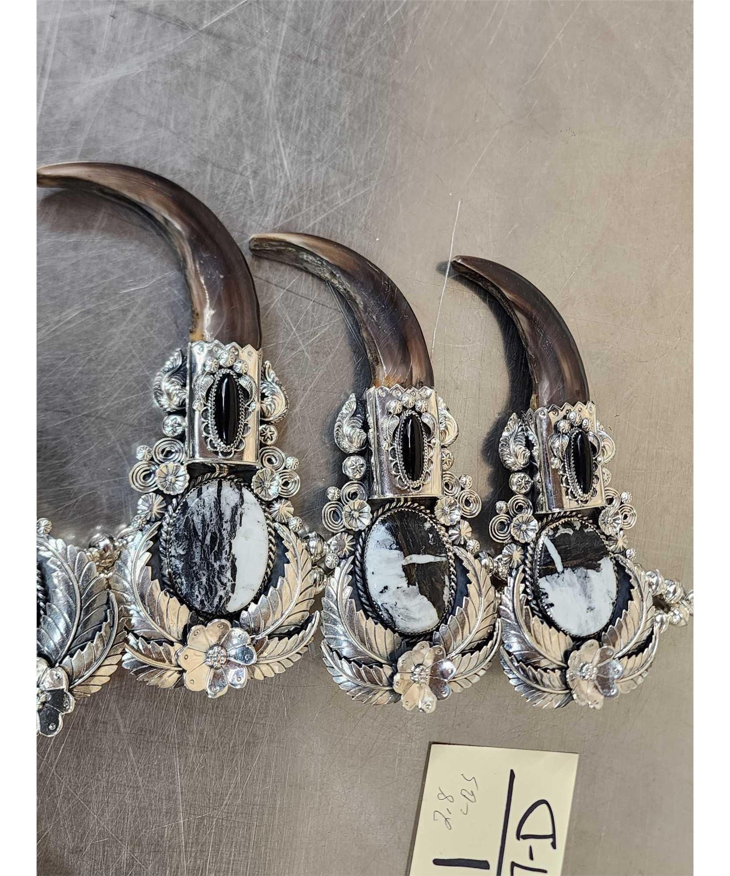 35.81 Unbelievable craftsmanship by NOW RETIRED artist Kenny Ray McNeilly Jr .We had the pleasure of talking with Kenny directly he indicated that there are VERY few piece of his artwork available for sale in his gallery there will be no more produced ! This true piece of art weighs 2.8 Lbs the weight is predominantly silver .Decorated with 10 Huge Alaskan Grizzly Bear Claws polished to a high sheen along with White Buffalo Turquoise Black Onyx stones .Take advantage of this opportunity to invest in this world class artwork for your collection!