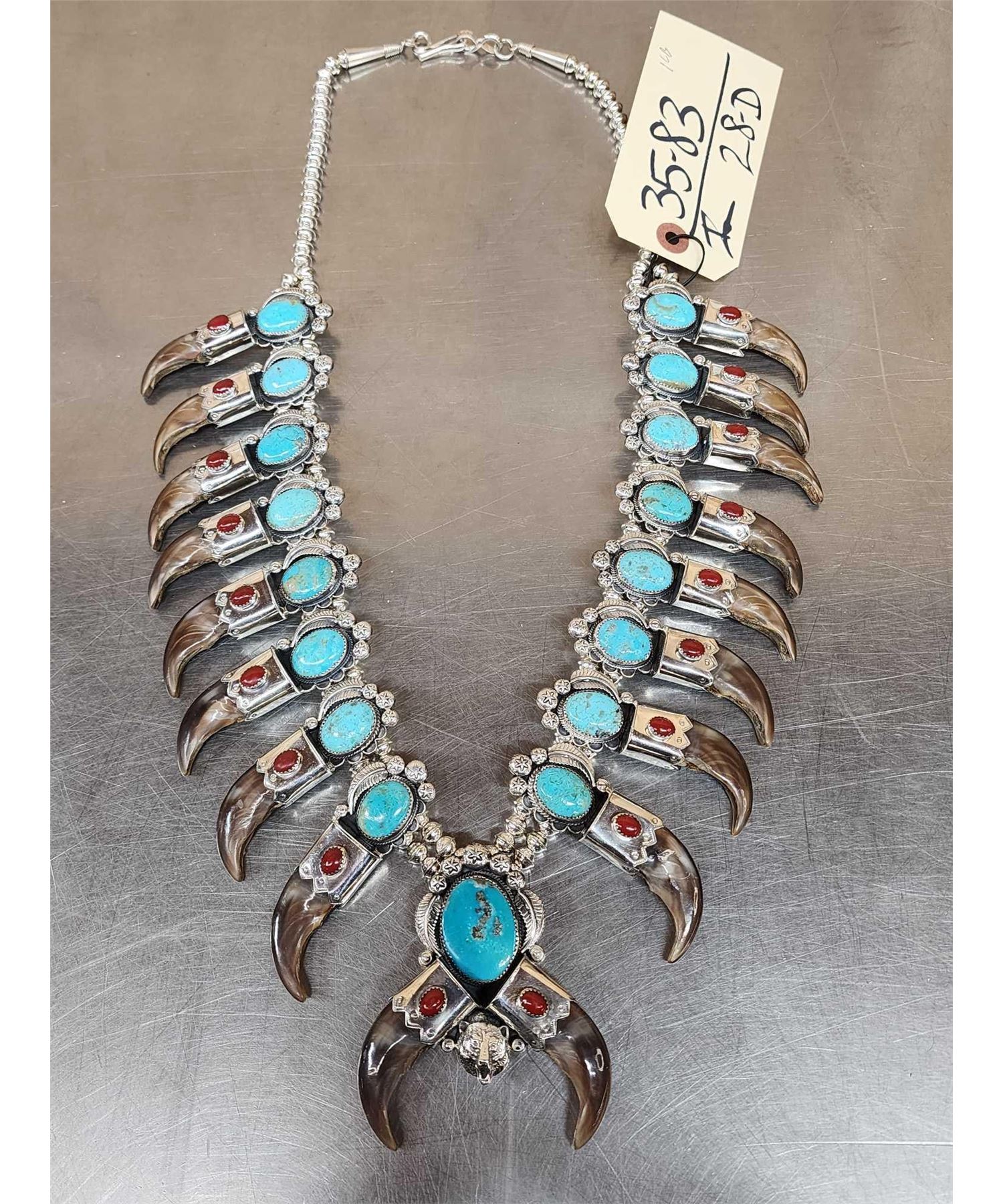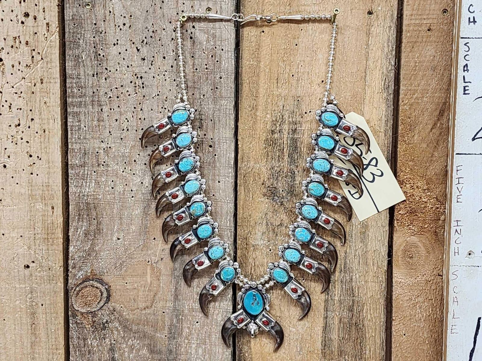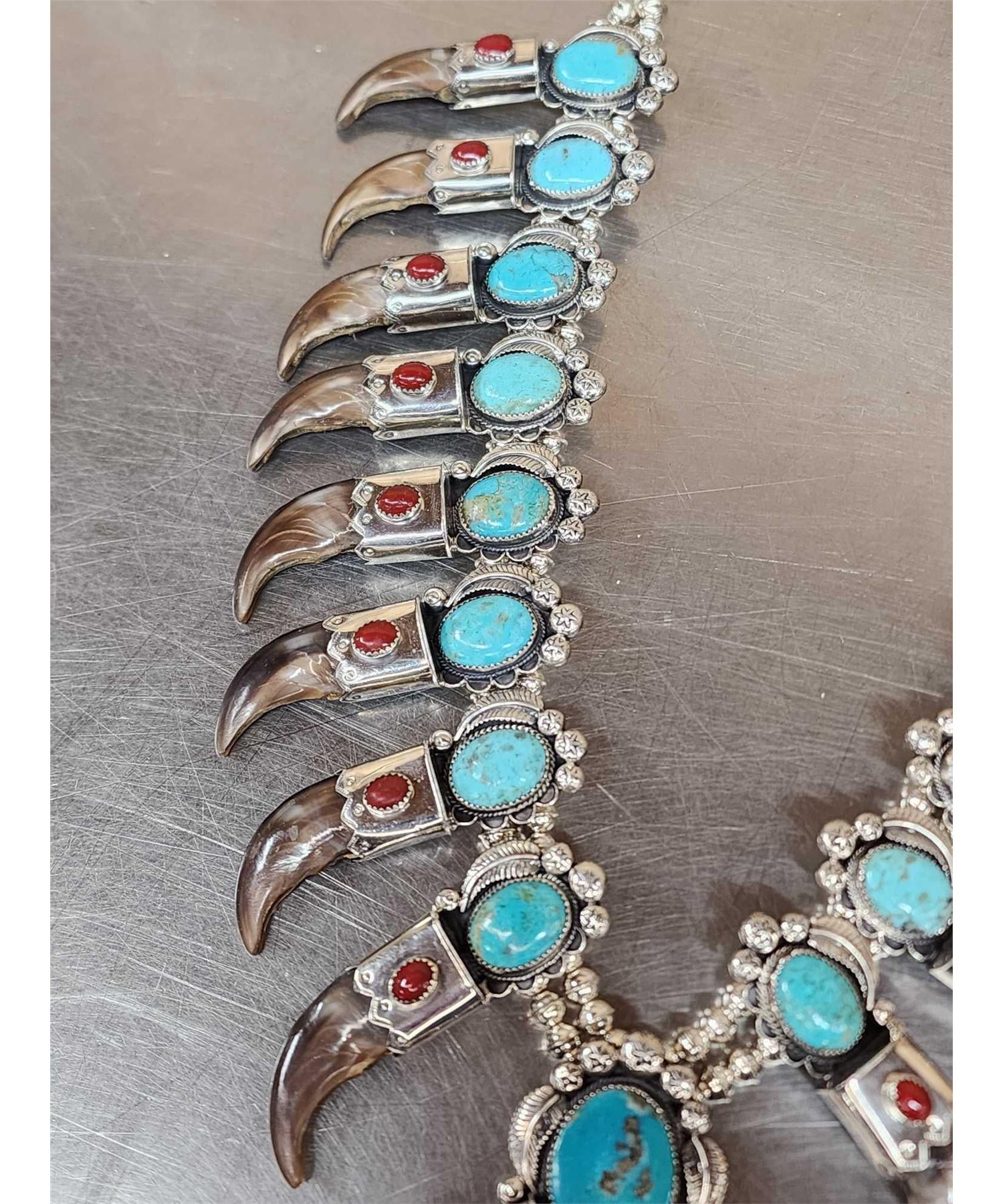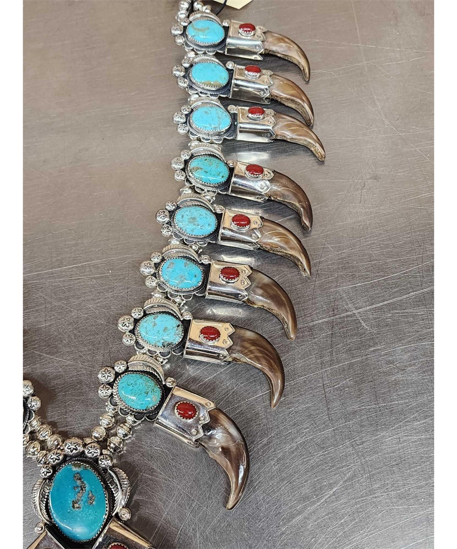 35.83 Highly detailed tooling necklace decorated with 18 black bear claws polished to a high sheen along with Turquoise Red Coral signed by now RETIRED artist Kenny Ray McNeilly Jr. Once these pieces are gone there will be no more to be had from the McNeilly gallery !Take advantage of this opportunity to invest in this world class artwork for your collection!Total weight 1 Lbs
