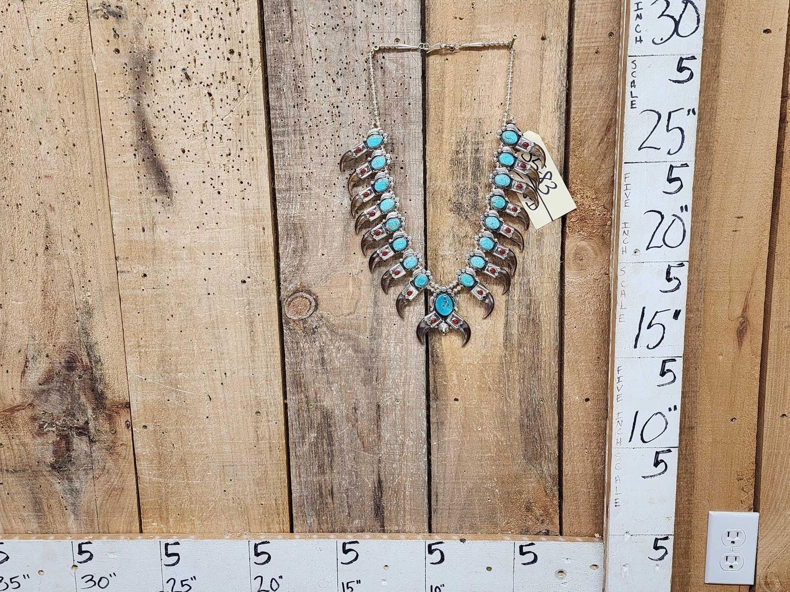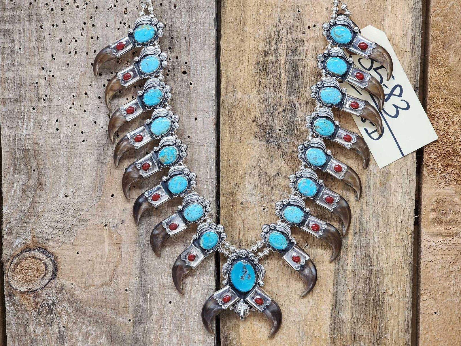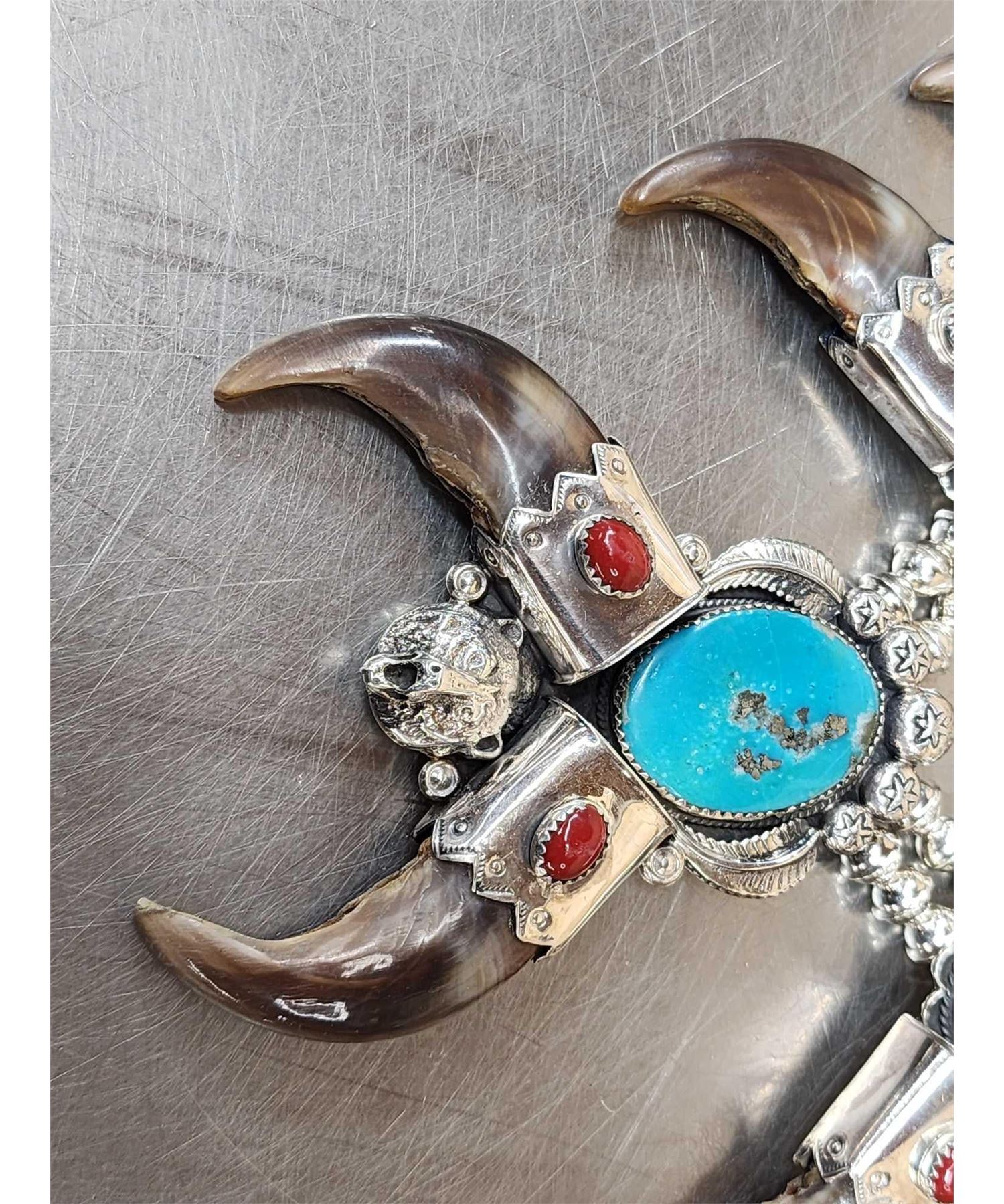 35.83 Highly detailed tooling necklace decorated with 18 black bear claws polished to a high sheen along with Turquoise Red Coral signed by now RETIRED artist Kenny Ray McNeilly Jr. Once these pieces are gone there will be no more to be had from the McNeilly gallery !Take advantage of this opportunity to invest in this world class artwork for your collection!Total weight 1 Lbs