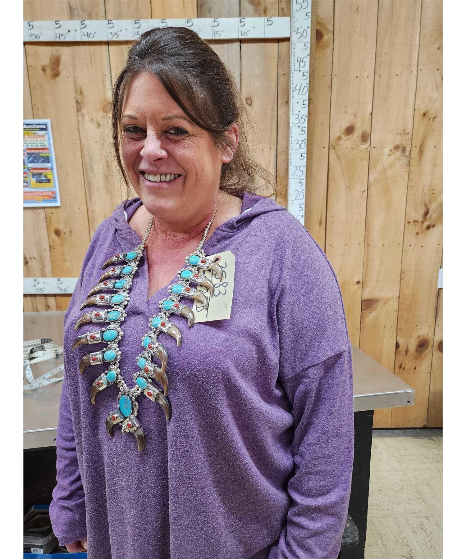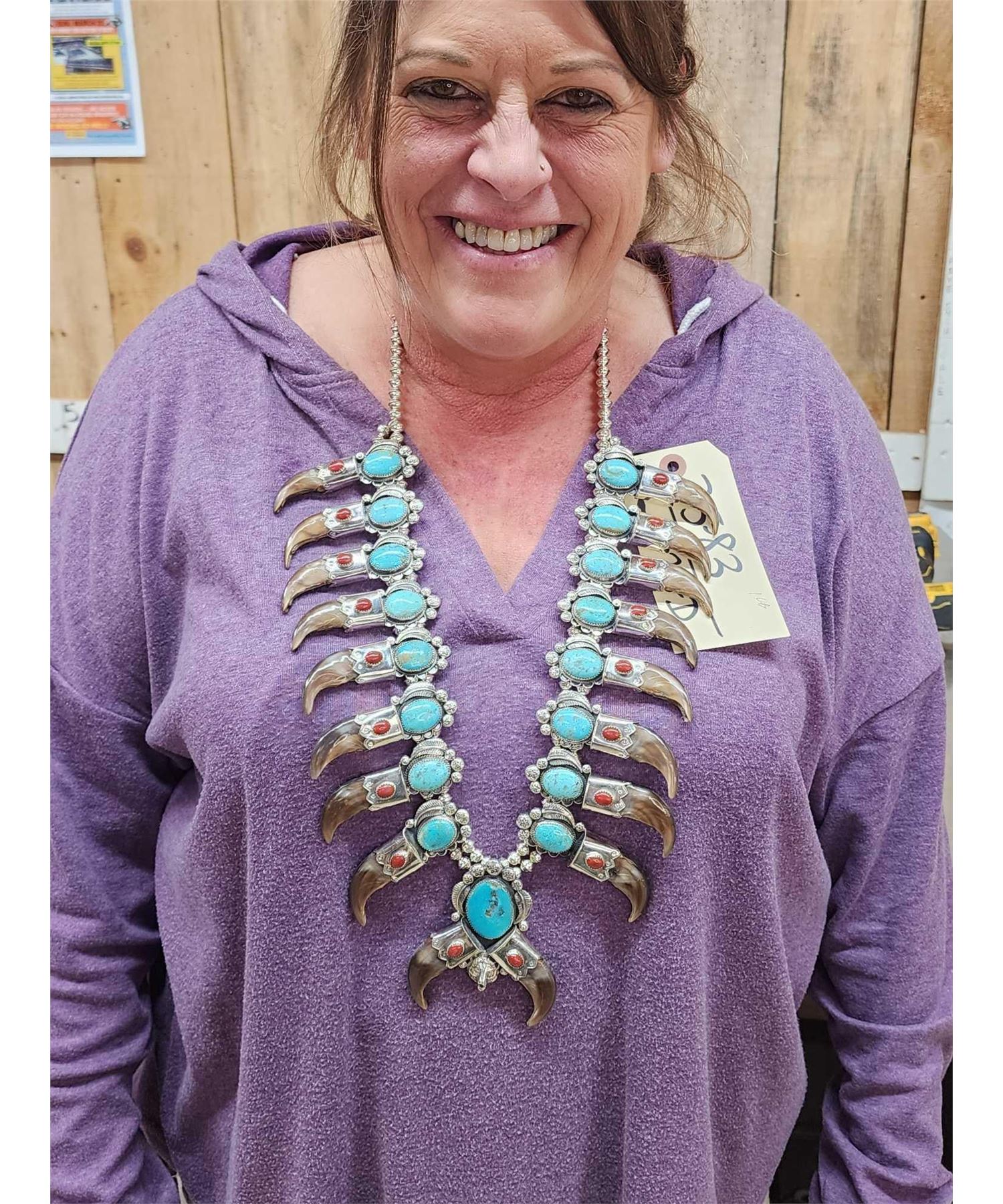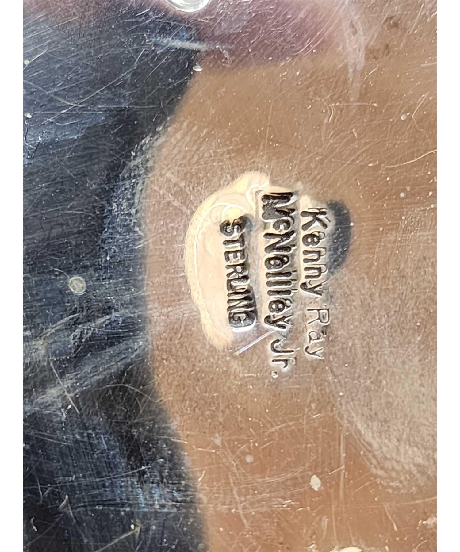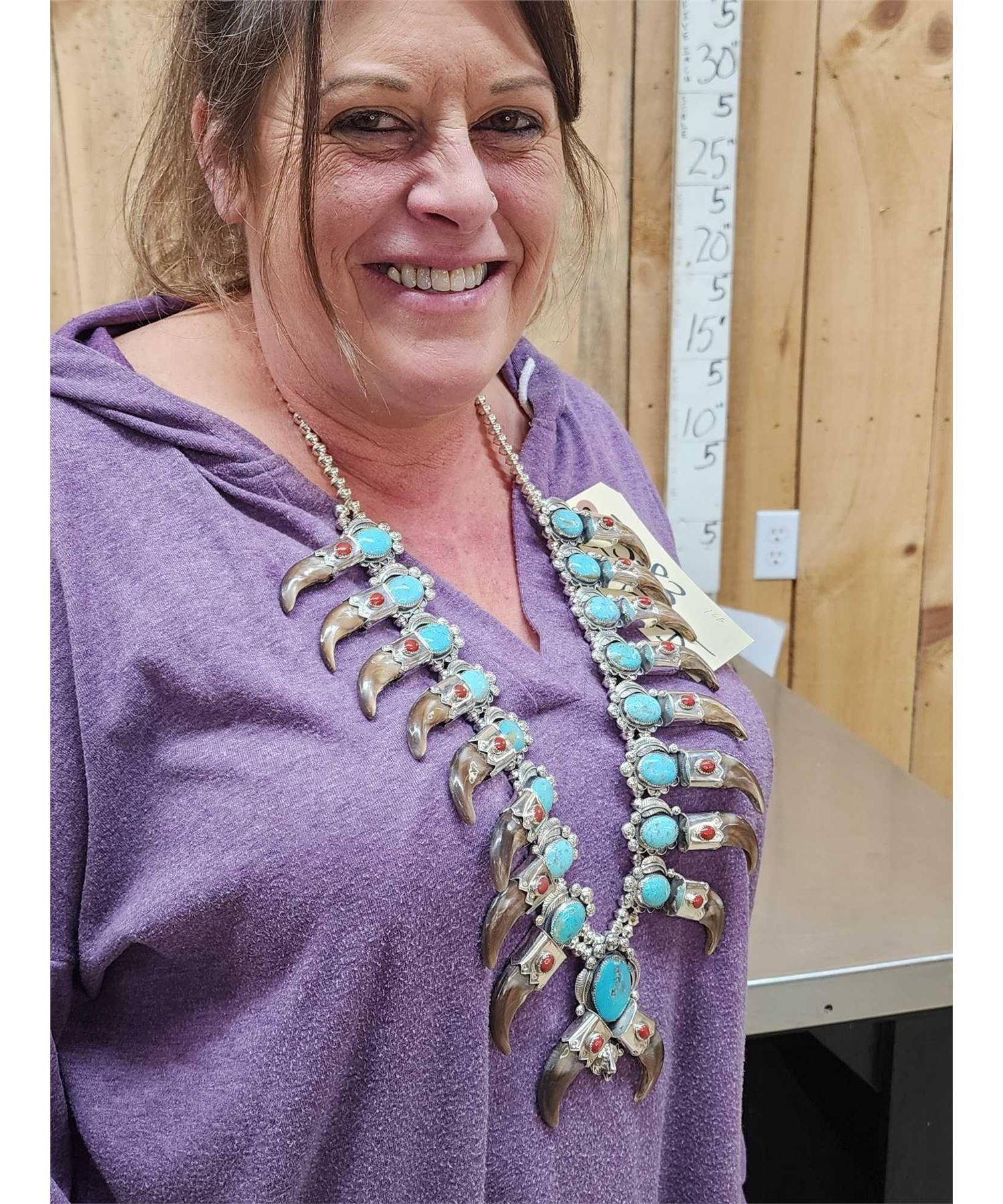 35.83 Highly detailed tooling necklace decorated with 18 black bear claws polished to a high sheen along with Turquoise Red Coral signed by now RETIRED artist Kenny Ray McNeilly Jr. Once these pieces are gone there will be no more to be had from the McNeilly gallery !Take advantage of this opportunity to invest in this world class artwork for your collection!Total weight 1 Lbs