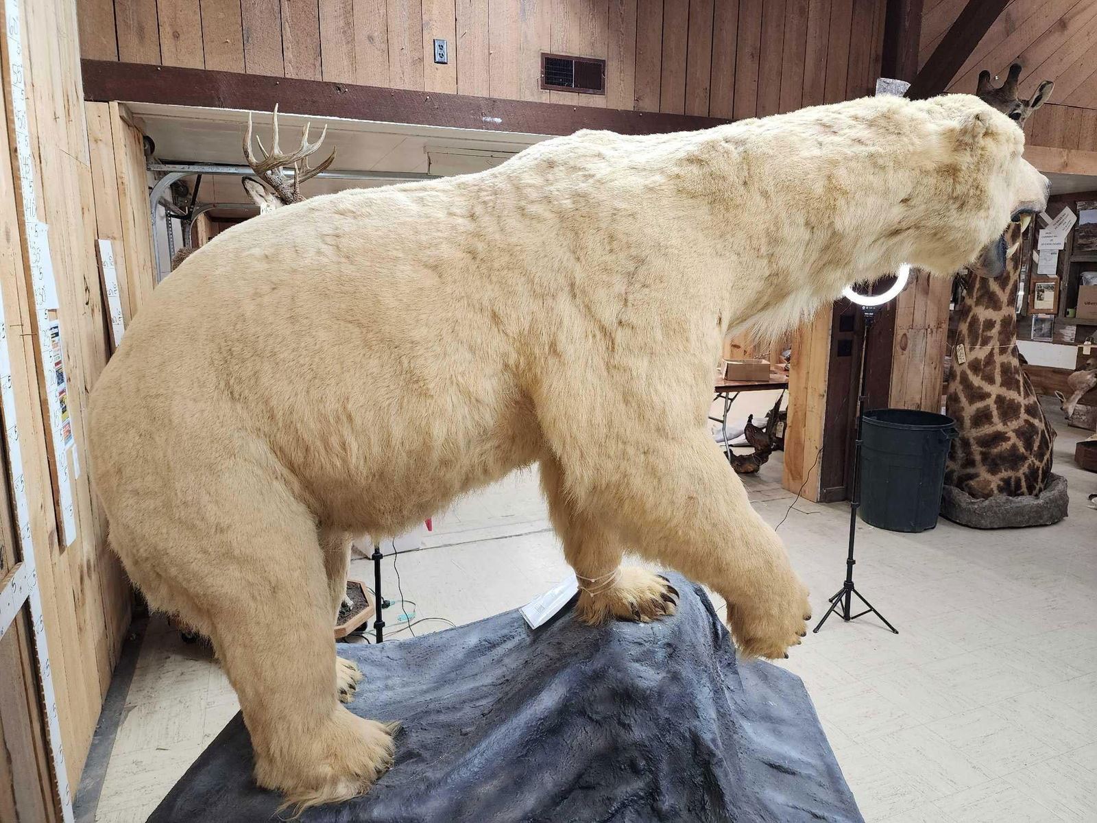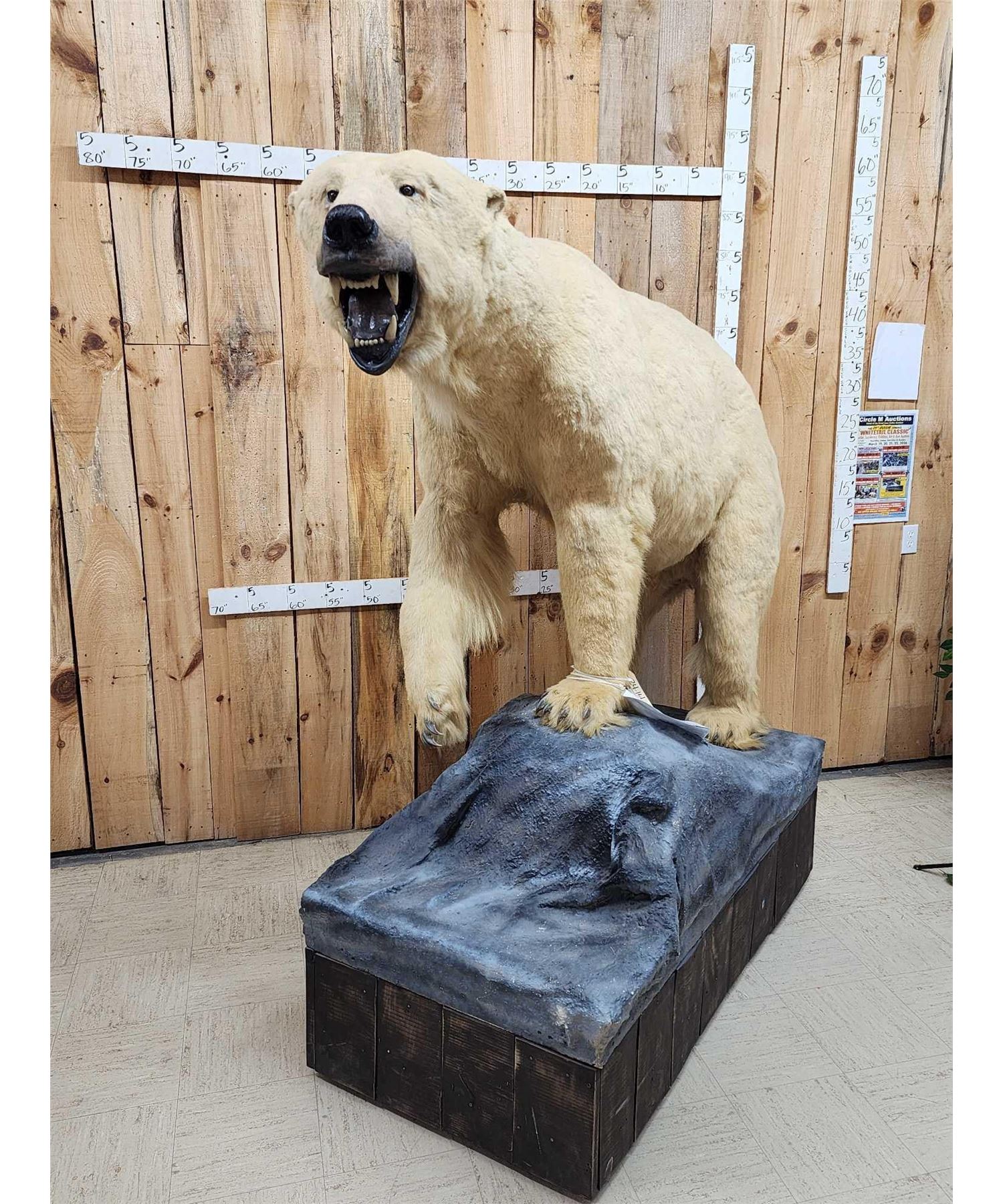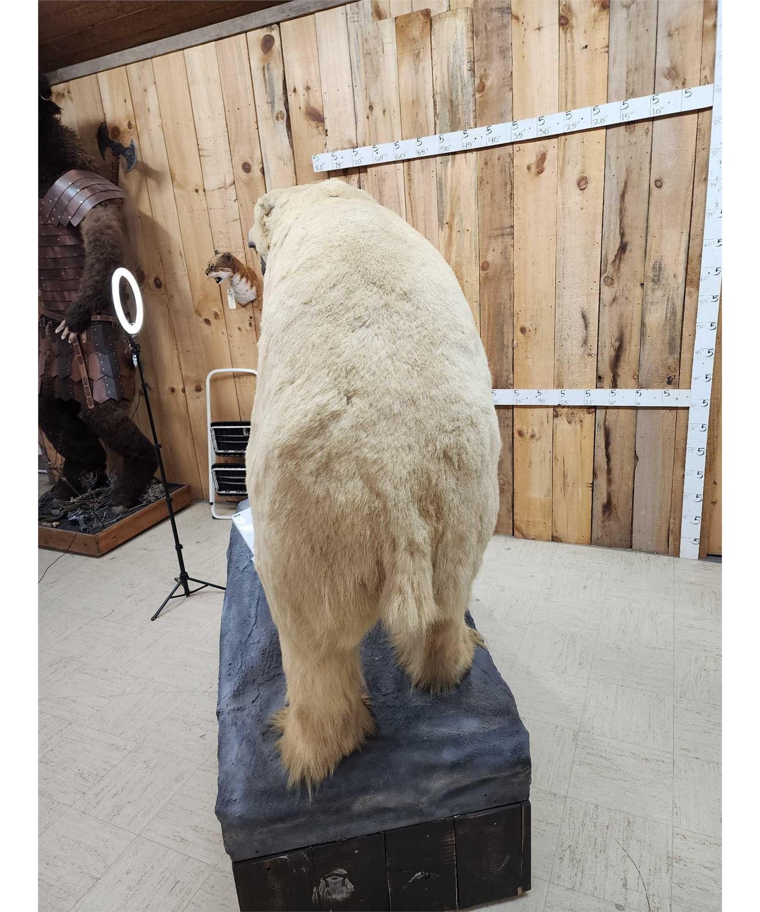 24.14 Harvested in Alaska in 1969 This big bear will make a huge statement in any room the bear itself measures about 100" from the tip of his nose to the base of his tail about 76" belly girth. Overall dimensions about 84" long x 77" tall x 34" wide .All things polar bear are becoming increasingly hard to find as they are snatched up by high end collectors take advantage of this opportunity to invest in this world class specimen for your collection