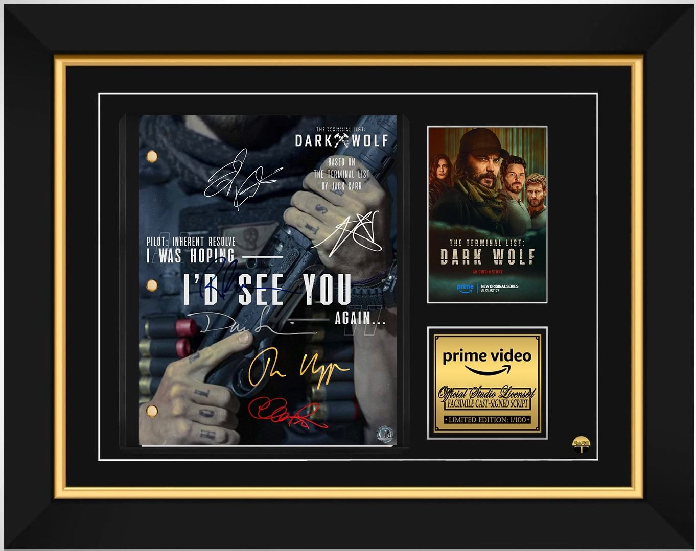 2: One each, The Terminal List: Dark Wolf with this gallery-framed, limited edition facsimile of hand-signed script, originally signed by Taylor Kitsch, Tom Hopper, Chris Pratt, Dar Salim, Luke Hemsworth, Robert Wisdom.