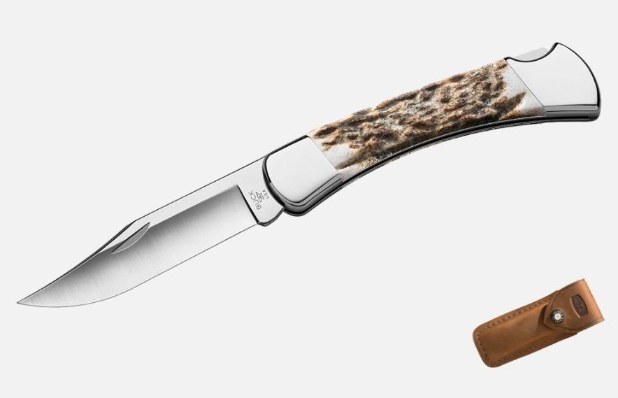 The knife features polished nickel bolsters with genuine Elk Antler handle, and a razor sharp clip point, 3 3/4" (9.5 cm), 420HC stainless steel blade. Securely locks in the open position with the lock back design. It folds down to a convenient 4 7/8" (12.4 cm) when closed and comes with a genuine brown distressed leather sheath so that it can be carried on your belt.
