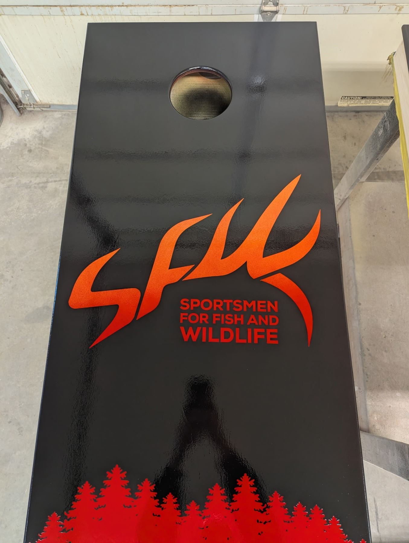 These hand-crafted, custom cornhole boards were created specifically for the Western Hunting & Conservation Expo silent auction by Brooks Greenwood - a guy who doesn't just make stuff, he finishes it. The result is a bold, clean look: a matte black field, blazing red MDF + SFW marks, a forest silhouette, and crisp icons that look right at home at elk camp and in your living room.