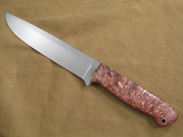 Handle: dyed and stabilized Box Elder Burl with black G10 liners, nickel silver pins and lanyard hole.