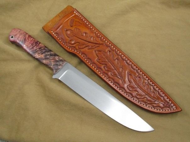 Sheath: Custom fitted leather sheath with hand carved oak leaves.