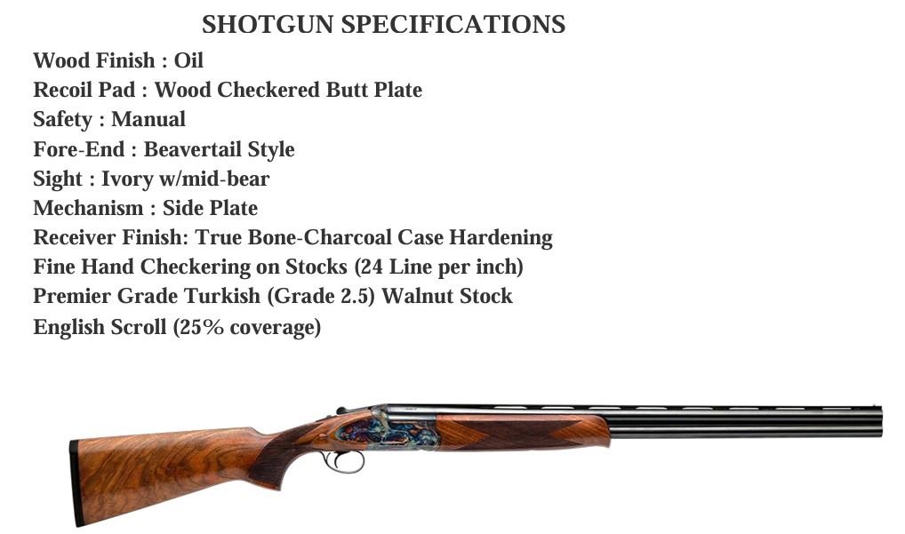 Features hand oiled premier grade Turkish walnut stock and fore-end with oil finish, 24-line per inch fine hand checkering, and comes with five thin-walled chokes, wood checkered butt plate, manual safety, English scroll engraving, and carrying case.