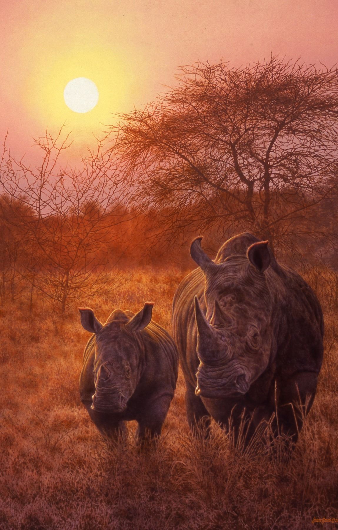 Internationally acclaimed Minnesota artist Brian Jarvi has created this limited-edition canvas print Rising Son featuring two White Rhino.