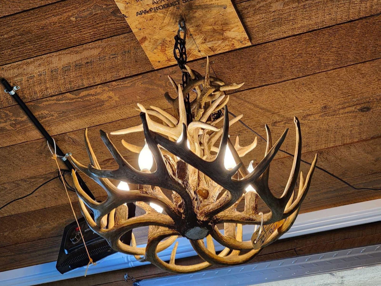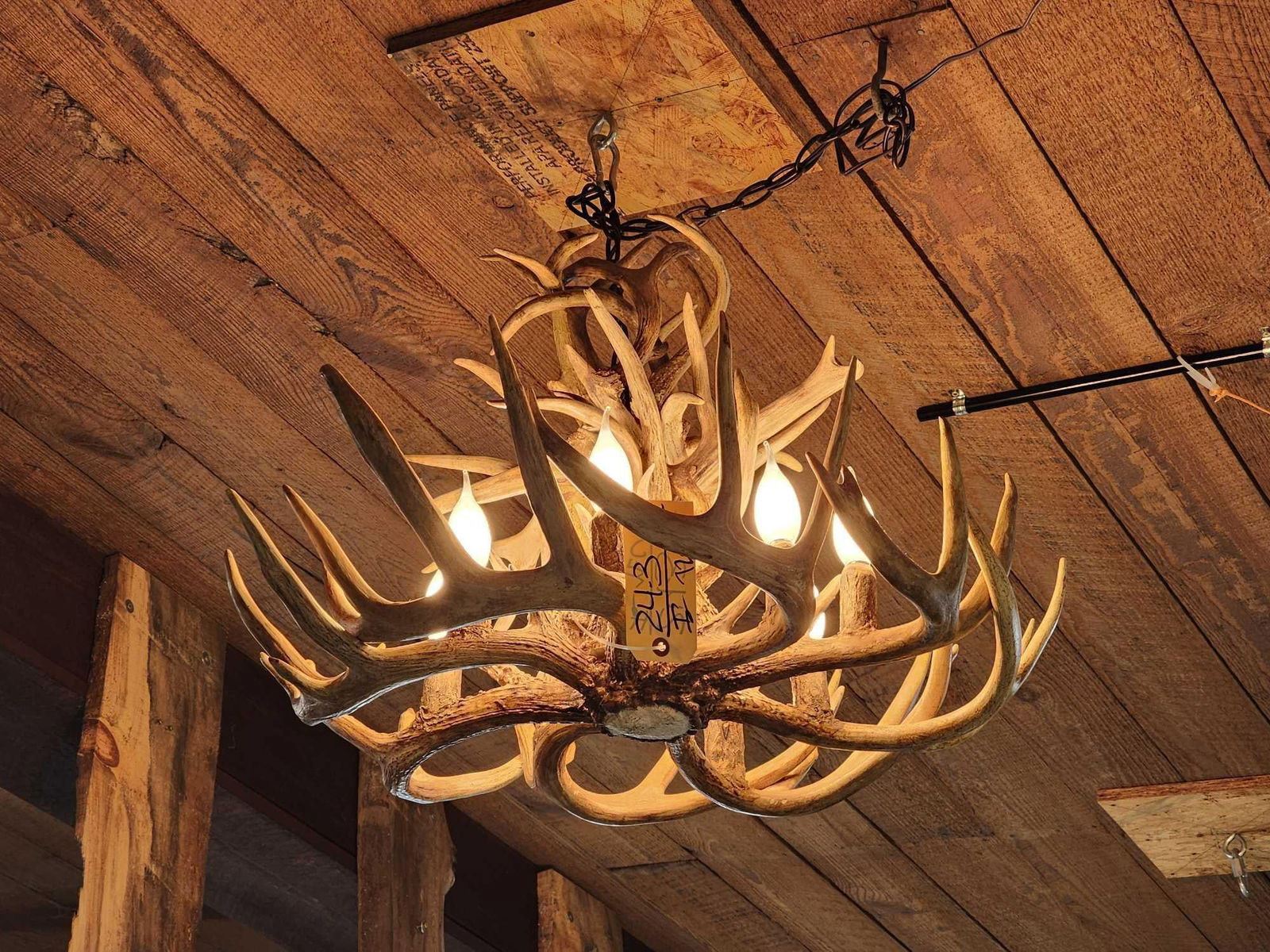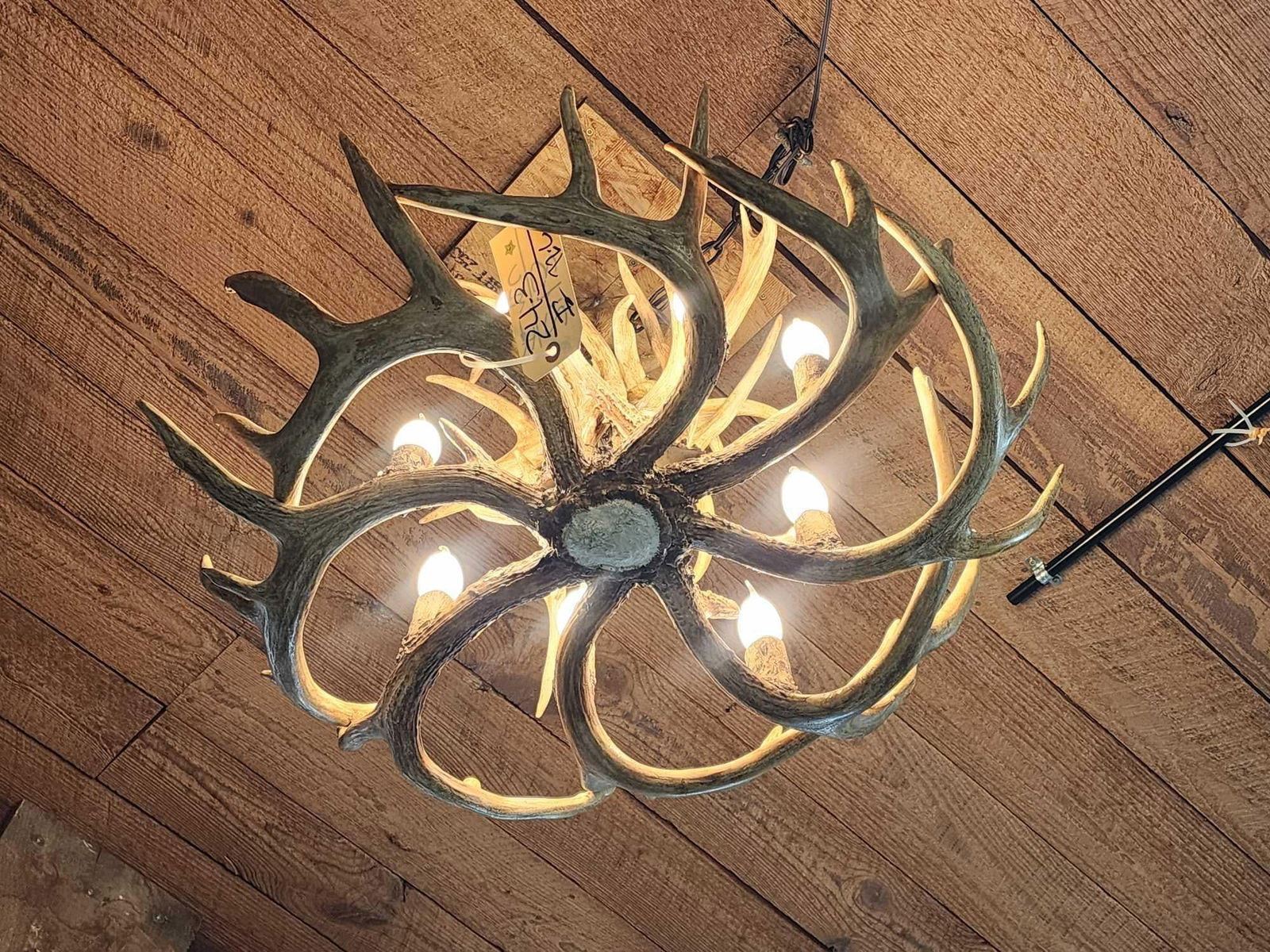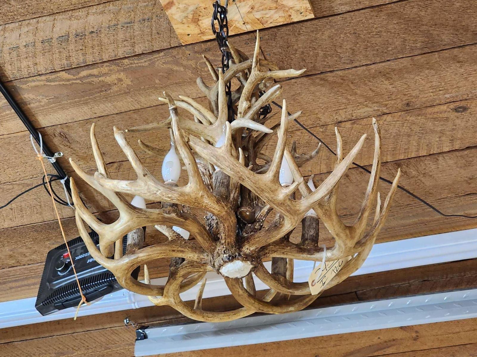 24.3 Well made chandelier with all real antler live edge wood socket accents the chandelier itself is about 29" wide x 21" tall