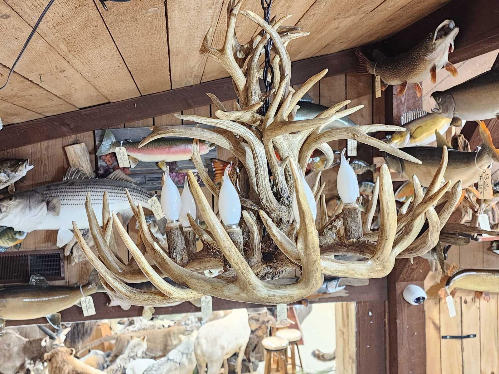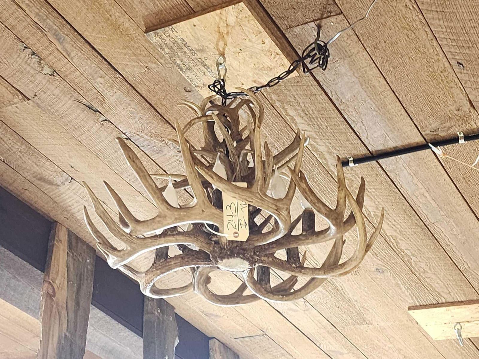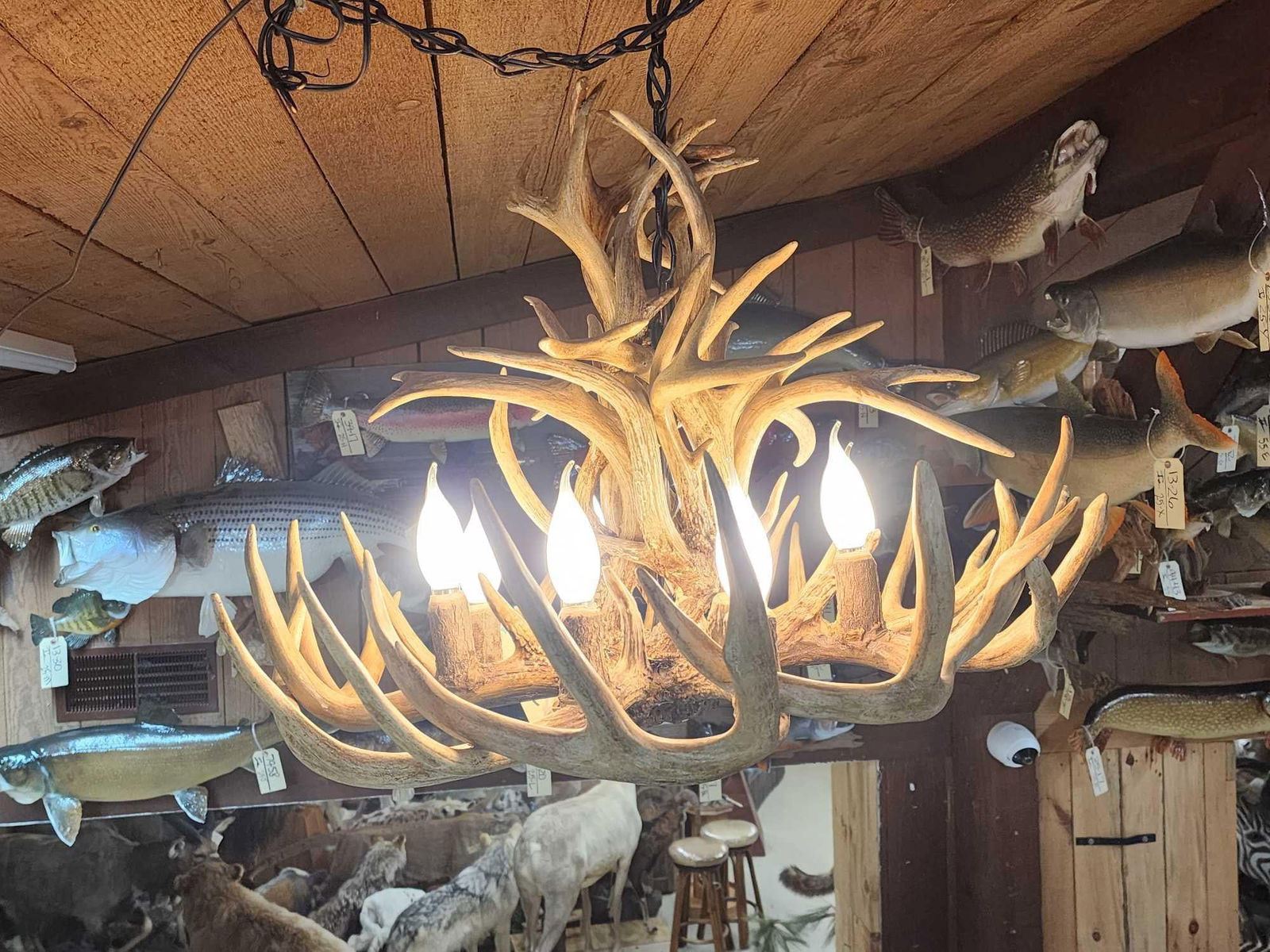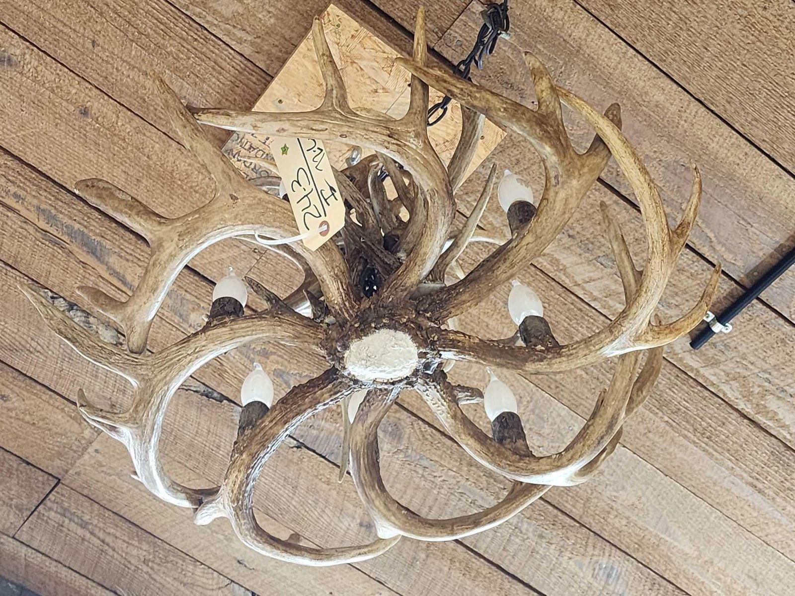 24.3 Well made chandelier with all real antler live edge wood socket accents the chandelier itself is about 29" wide x 21" tall