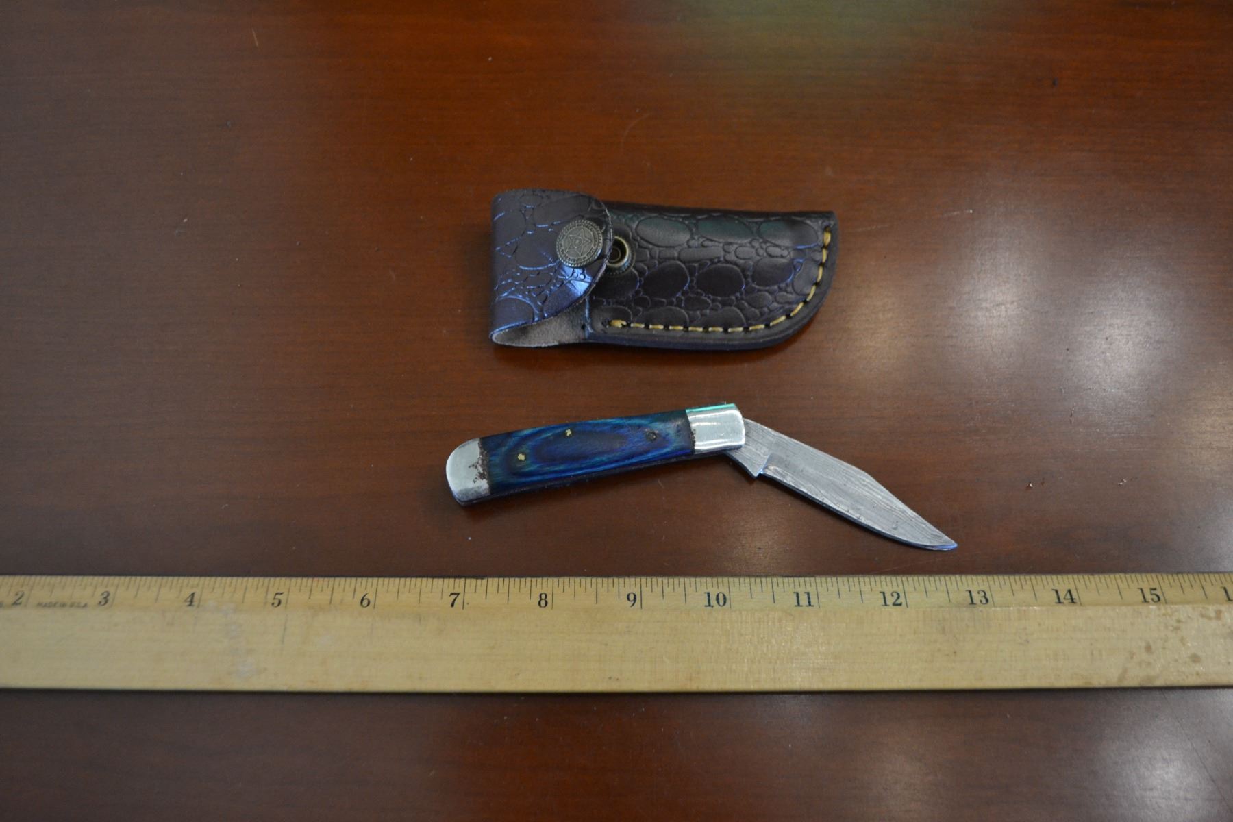 Lot 254 Hand Forged Damascus Steel Folder w/ Leather Sheath