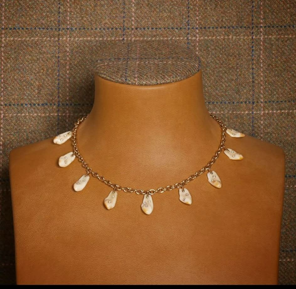 * It is adorned with 14 speckled Tusks (Red Deer) dangling on a handmade collar necklace.