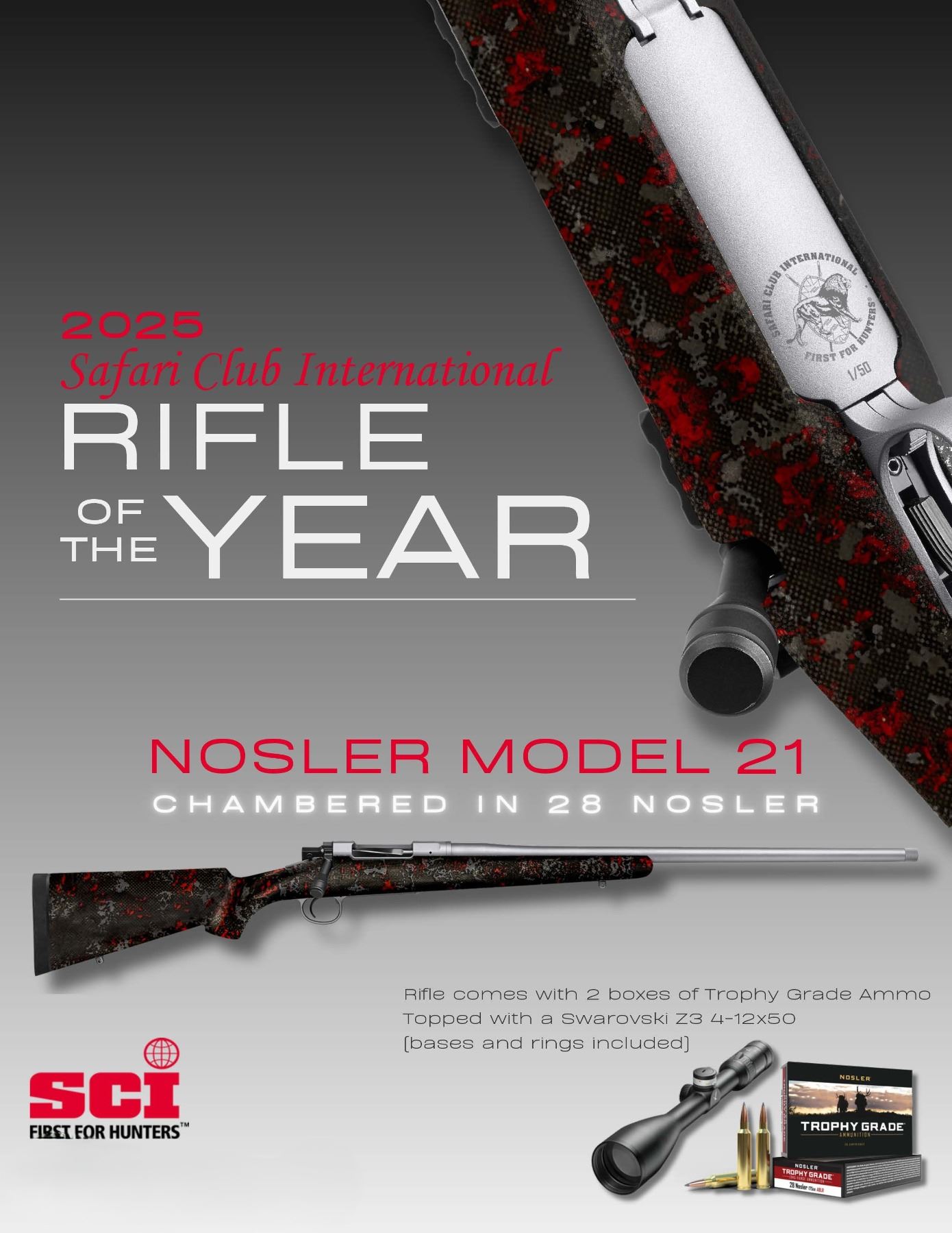 SCI Rifle of the Year - Nosler 21 Chambered in 28 Nosler Topped with a Swarovski Z3 4-12x50 and comes with 2 boxes of Trophy Grade Ammo