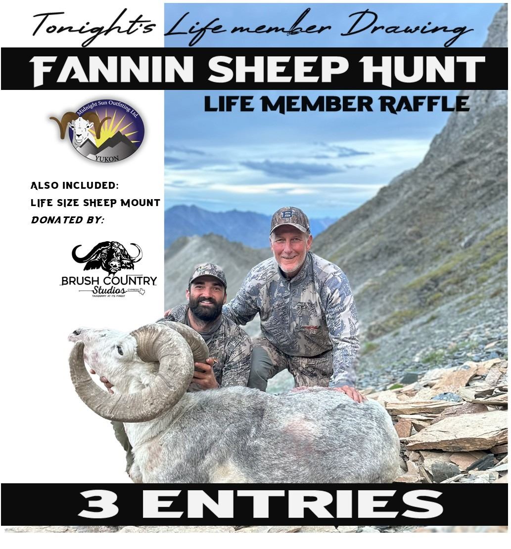 Buyer must visit the Life member table to put your entry into the drawing for the Fannin Sheep Hunt at banquet which will be held immediately following the auction. Must be registered for banquet and present to win.
