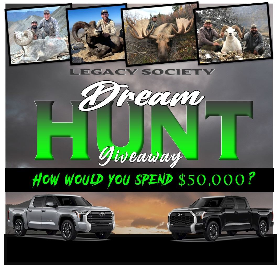Additional entries can be purchased for $50 each. Winner will be given a $50,000 credit to use with any of our 340+ Conservation Partners that include outfitters, Toyota dealer, optics, guns, gear, apparel, etc. Credit can be spent with a registered business for a 10% administration fee.