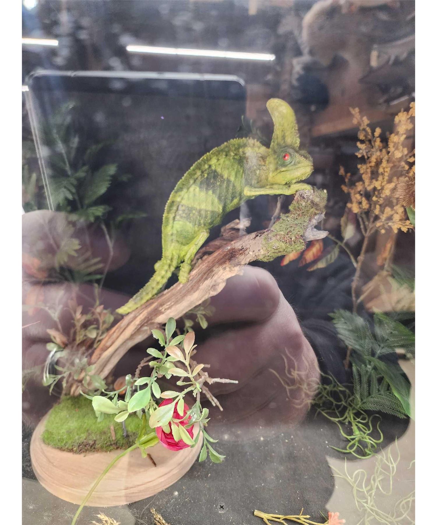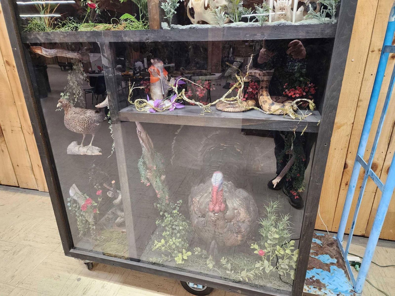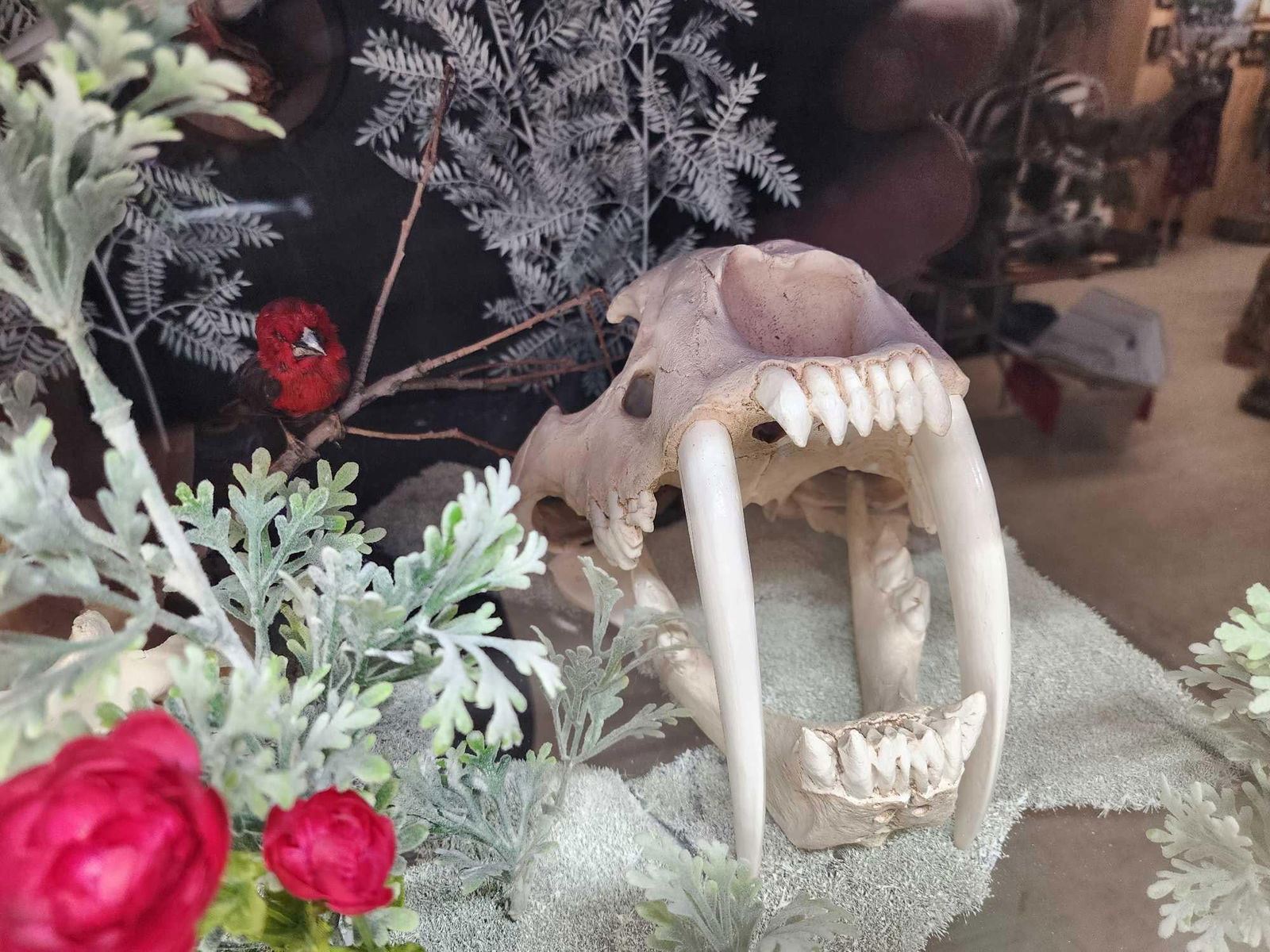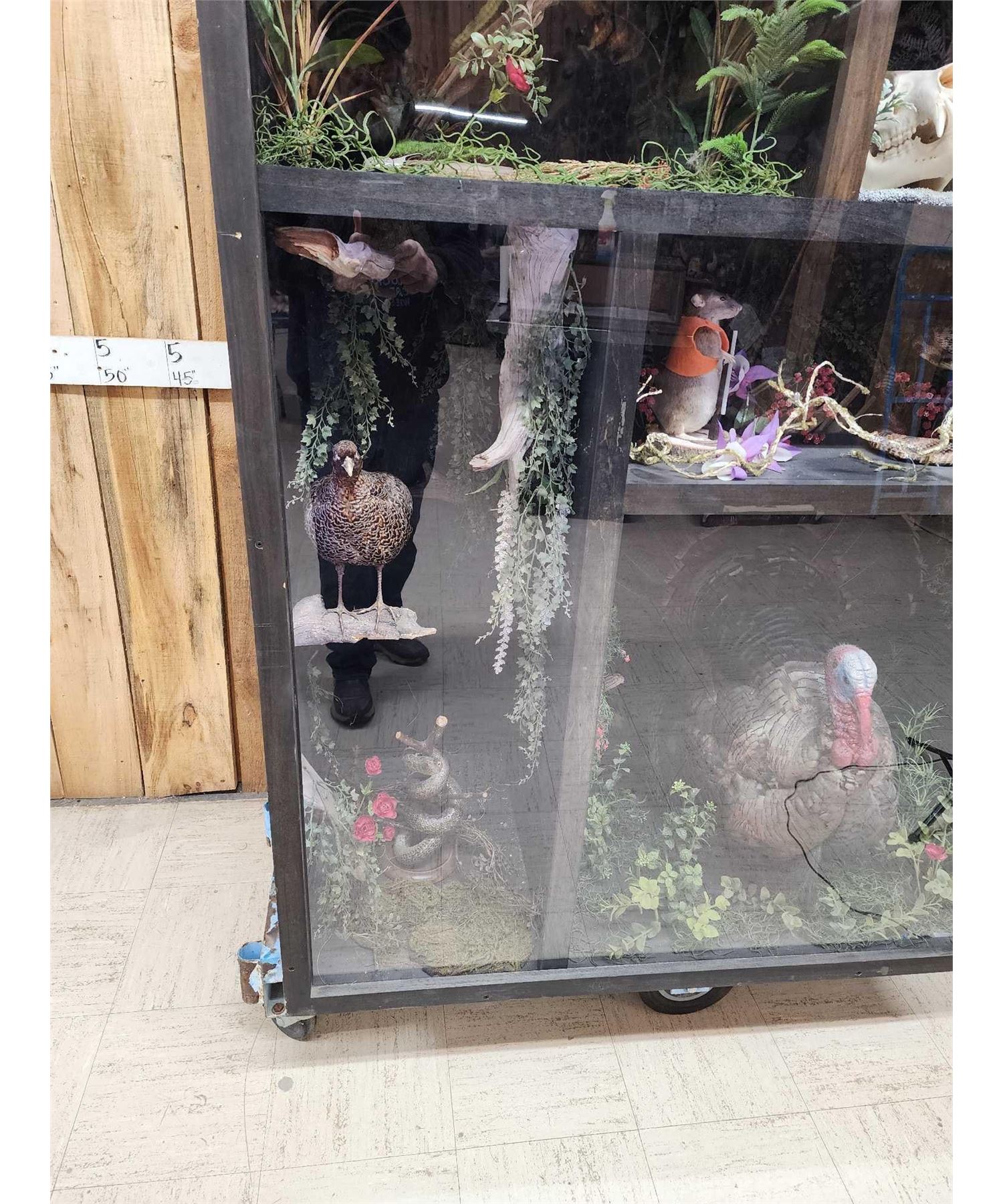 79.89 Cool piece lighted cabinet with Chameleon, Beetles , Black Bear Skull , Ringed Turtle Dove , Reproduction Saber Tooth Tiger skull , Parakeet , Sharp Tail Grouse , Grass Snake , Hunting Rat , Rattlesnake , Turkey Full Body Bird Taxidermy overall dimensions about 60" tall x 48" wide x 24" deep