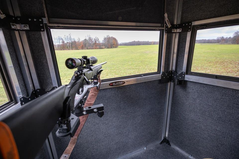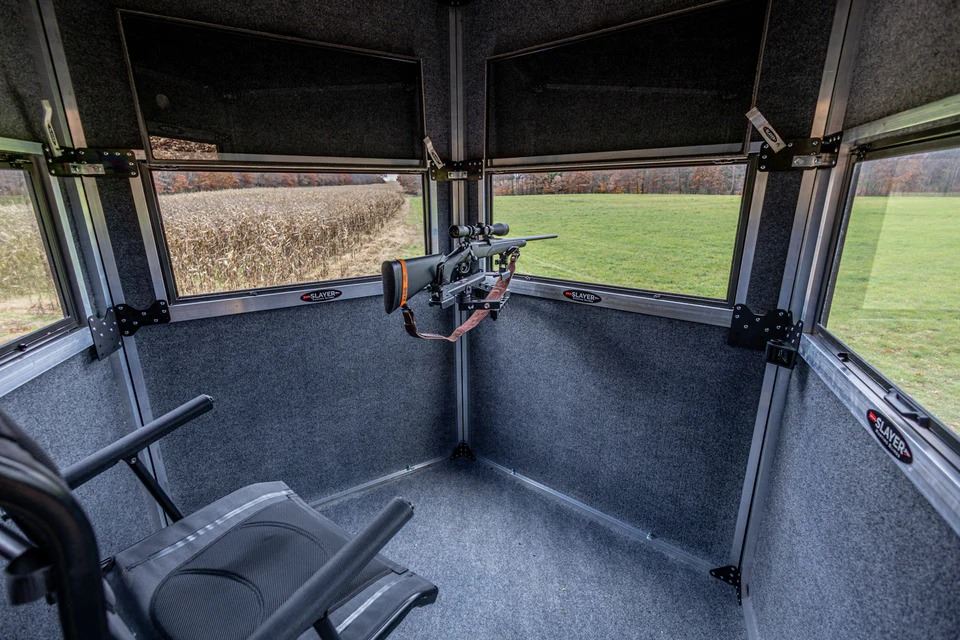 Rob Trowbridge has donated a Slayer Hunting Blind. The Slayer Blind is a 5-sided blind with large horizontal silent operating windows so it can be used for gun or crossbow hunting. This is a permanent hard-sided hunting blind that is also modular. All 5 sides, the roof, and the base can be taken apart and moved in minutes. The walls and bases are fully carpeted to provide a quiet and comfortable interior. The roof is one piece polymer for no leaking. The side walls are 6’6” tall, the center ceiling height is 7’3”, and the interior floor plan measures over 6’ from point to point. Shipping of this blind is included for the winning bidder.