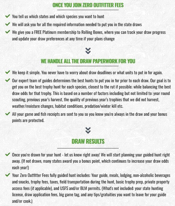 NOT INCLUDED: Annual state hunting licenses, application fees ($45 per species, per state), state big game tag fees (paid only when you draw).