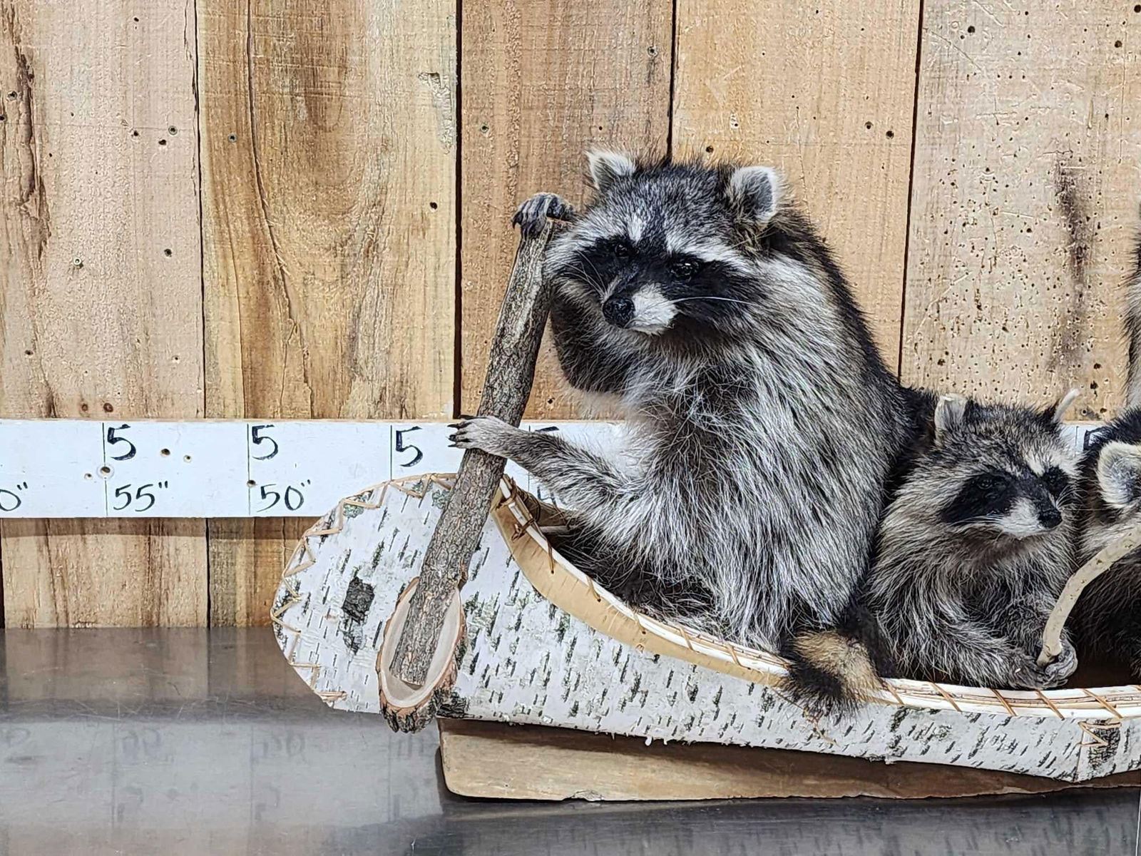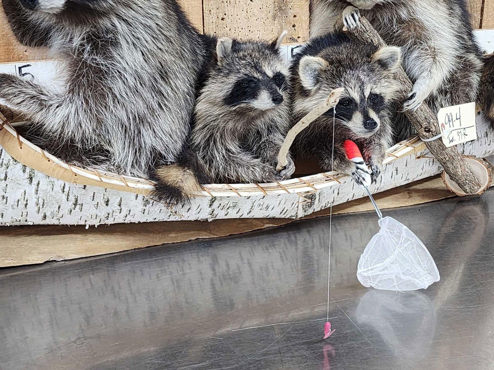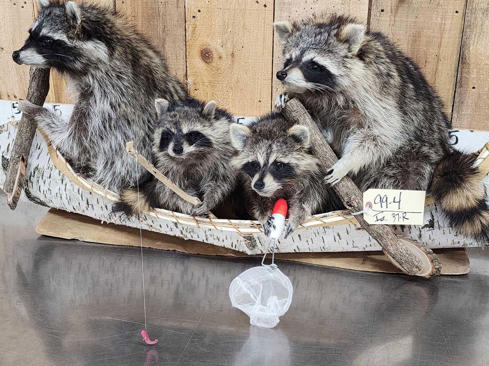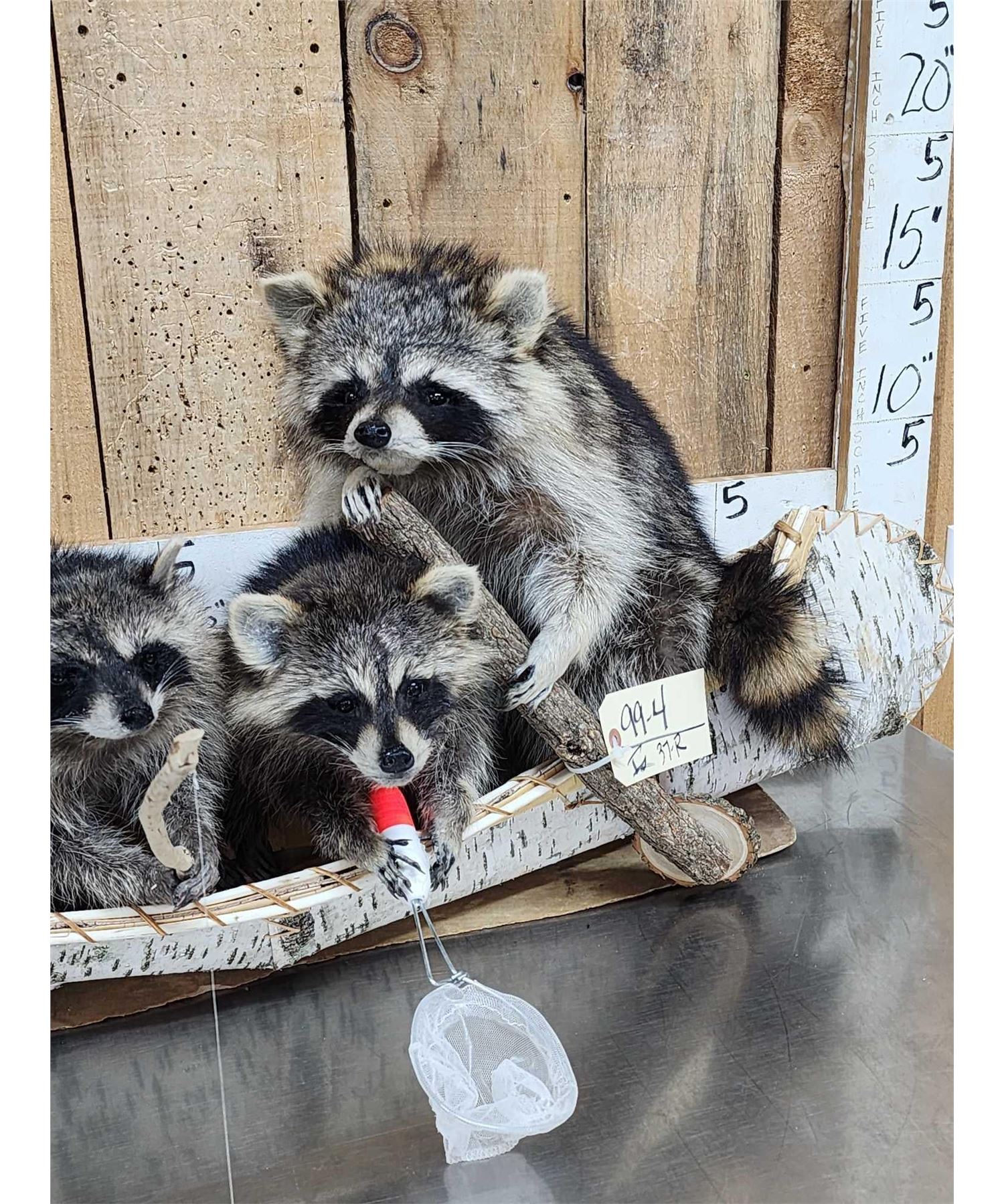 Lot 37R Family Of Raccoons Fishing In A Birch Bark Canoe Taxidermy